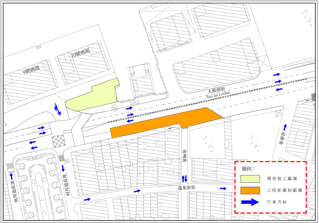 配合內港南雨水泵站及下水道第三期工程進行,將開展柯邦廸前地與道德巷的一段火船頭街的雨水箱涵,4月13日開始現場因應工程需要將新增工程圍封範圍進行施工(詳見附圖),同時,介乎火船頭街與蓬萊新街之間的一段夜呣街改作無出口道路。