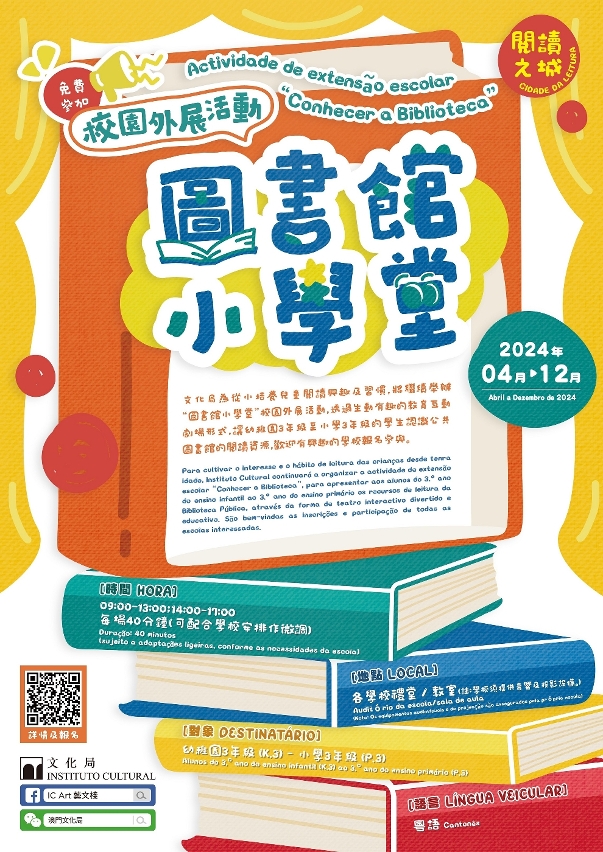 由文化局主辦的“圖書館小學堂”校園外展活動4至12月期間舉行,由即日起接受學校報名,活動對象為幼稚園3年級至小學3年級的學生,名額共40場,費用全免,額滿即止。