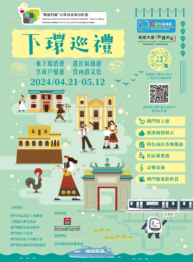 “下環巡禮”於4月21日至5月12日期間在內港、司打口、下環及媽閣一帶舉行。內容包括澳門海上遊、漁港風情展示、特色商店各類優惠、社區導賞遊、音樂表演及澳門微電影欣賞,讓參加者瞭解下環區的歷史文化,感受漁港風情。“下環巡禮”聯合下環區商戶,於活動期間提供不同的優惠,推廣區內特色商戶,吸引更多旅客和居民到該區消費。有關詳細內容,可瀏覽“下環巡禮”網站(https://macauonline.net)。