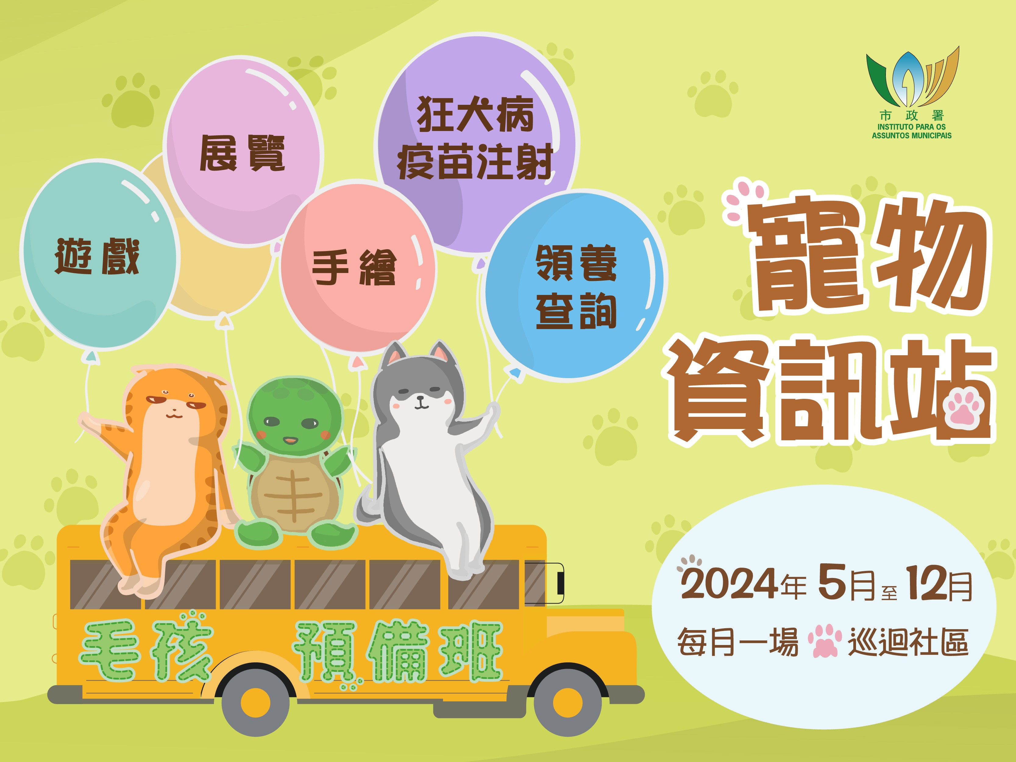 市政署聯同動保團體於5月至12月期間,在全澳多區舉辦“毛孩預備班─寵物資訊站”。今年除設攤位遊戲及展覽活動外,更新增領養查詢及狂犬病疫苗注射服務,便捷居民,並普及動物領養及飼主責任訊息。