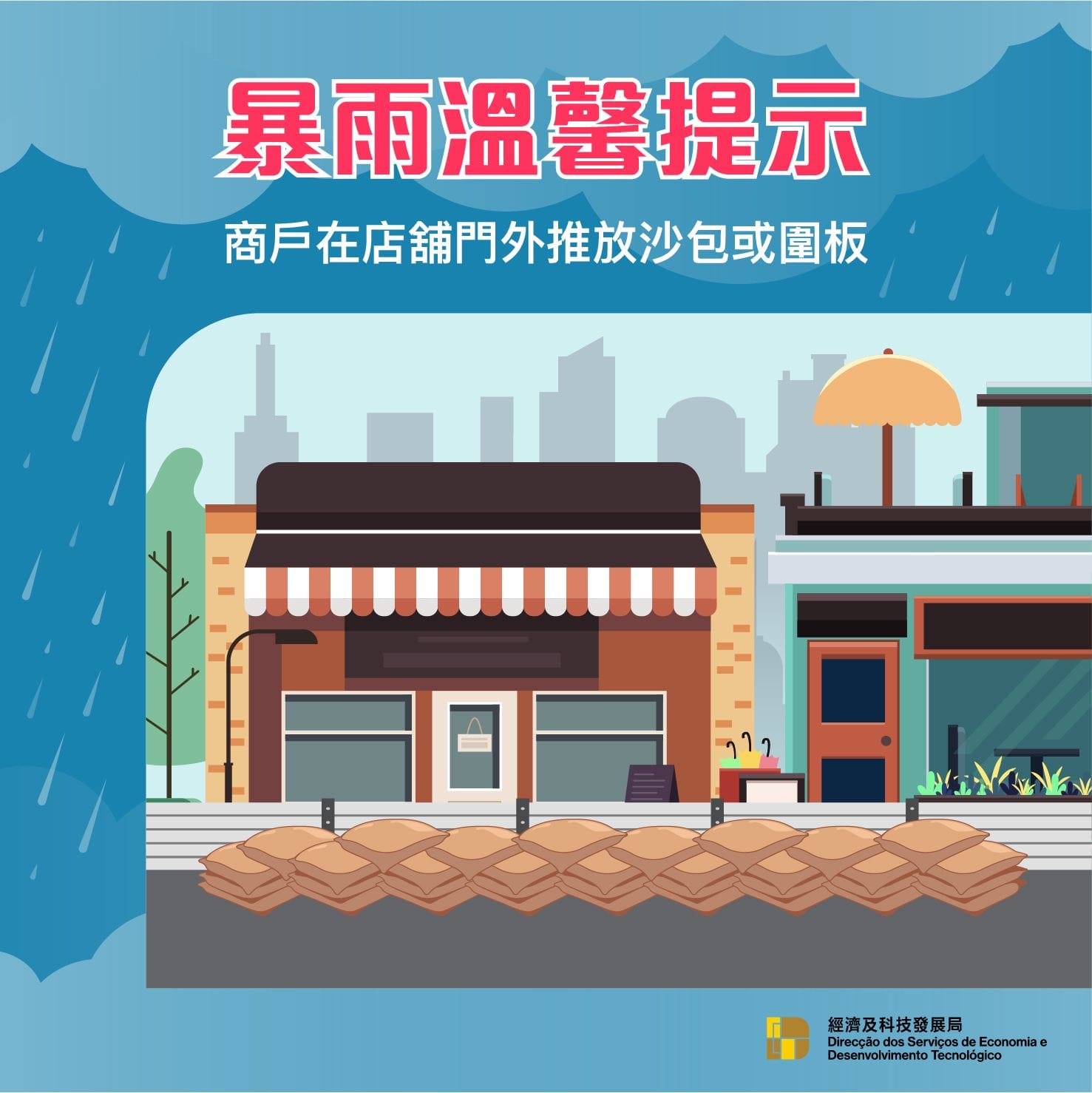經濟及科技發展局提醒位處低窪地區的商戶應密切留意氣象局發佈的最新天氣消息,並採取適當防浸措施,如將貨物放於較高位置,使用防洪門閘板及其他防洪設施,以免造成貨物及設備損失。