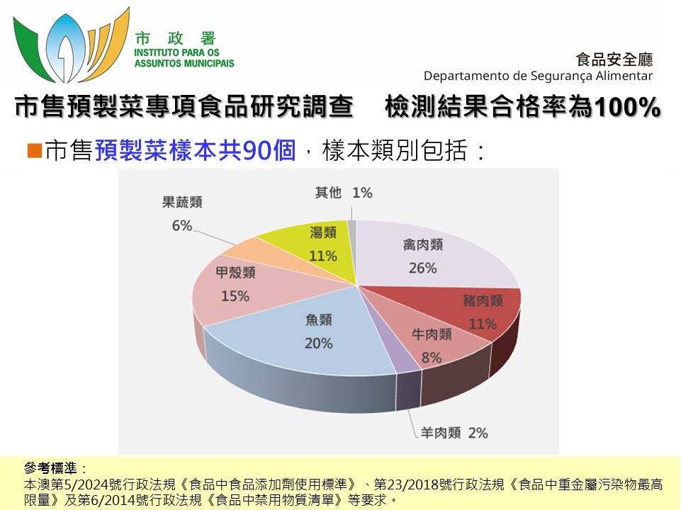 近年隨著生活節奏加快,預製菜因翻熱便利、出餐快捷等特點,成為消費者和餐飲業界的新焦點,在國內外市場亦逐漸普及。而預製菜產品的生產衛生和食品安全也備受關注。影響預製菜食用安全的因素很多,如食材污染、環境污染、處理方式、人為操作等。為瞭解本澳市售預製菜的食安情況,市政署於市面上抽取合共九十個預製菜樣本,包括鹽焗雞、酸菜魚、小龍蝦等,進行食品添加劑、重金屬和塑化劑檢測,並因應不同烹調方式的預製菜進行了蘇丹紅、二甲基黃和硼砂或硼酸等禁用或非食用物質檢測,所有預製菜產品樣本均通過檢測,結果未見異常。
