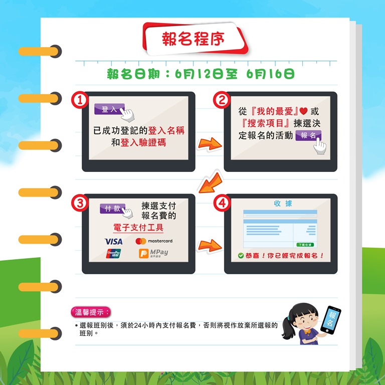 如未能於2024年6月7日前成功登記者,可於餘額登記期2024年6月12日上午10時至6月15日晚上10時透過暑期活動網頁或“一戶通”進行餘額登記。本年度每位參加者在報名期間可報一個班別,在餘額報名期可多報兩個班別。