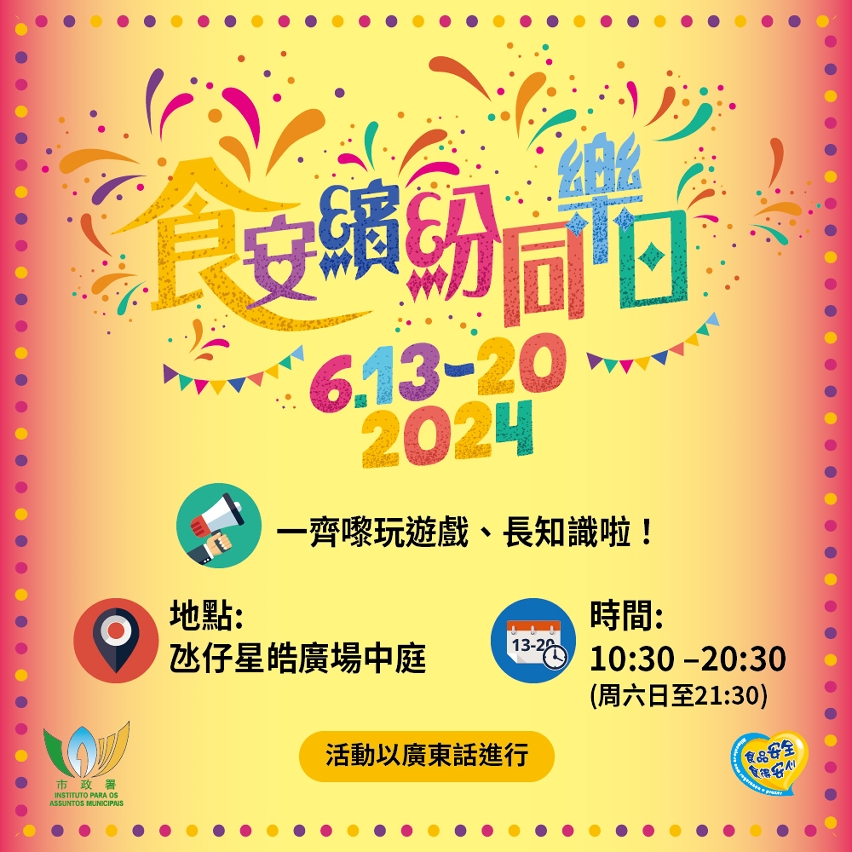 為持續推廣社區食安教育,市政署將於6月13日至20日於氹仔星皓廣場中庭舉行“食安繽紛同樂日2024”活動,現場設攤位遊戲、展覽等,讓公眾以輕鬆有趣的方式,學習生活中的食安知識,並實踐到個人習慣之中,共同維護本澳食品安全,歡迎市民踴躍參加。