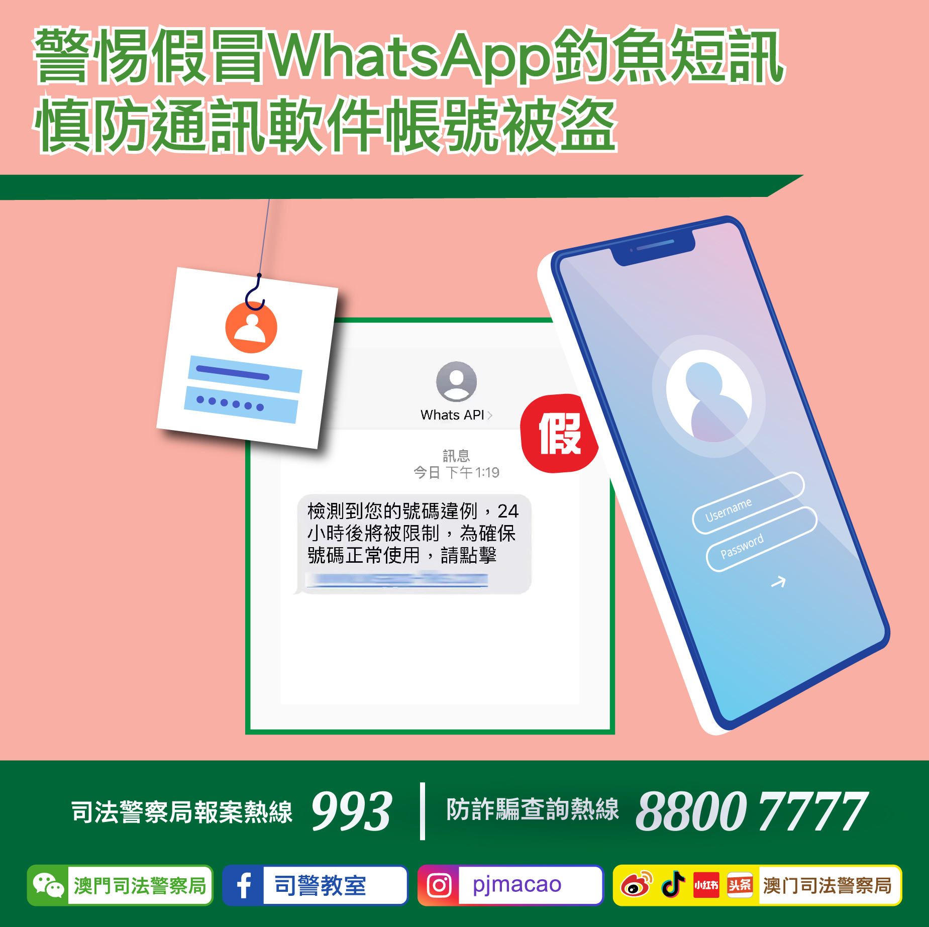 • 司警局呼籲市民警惕假冒通訊軟件釣魚短訊