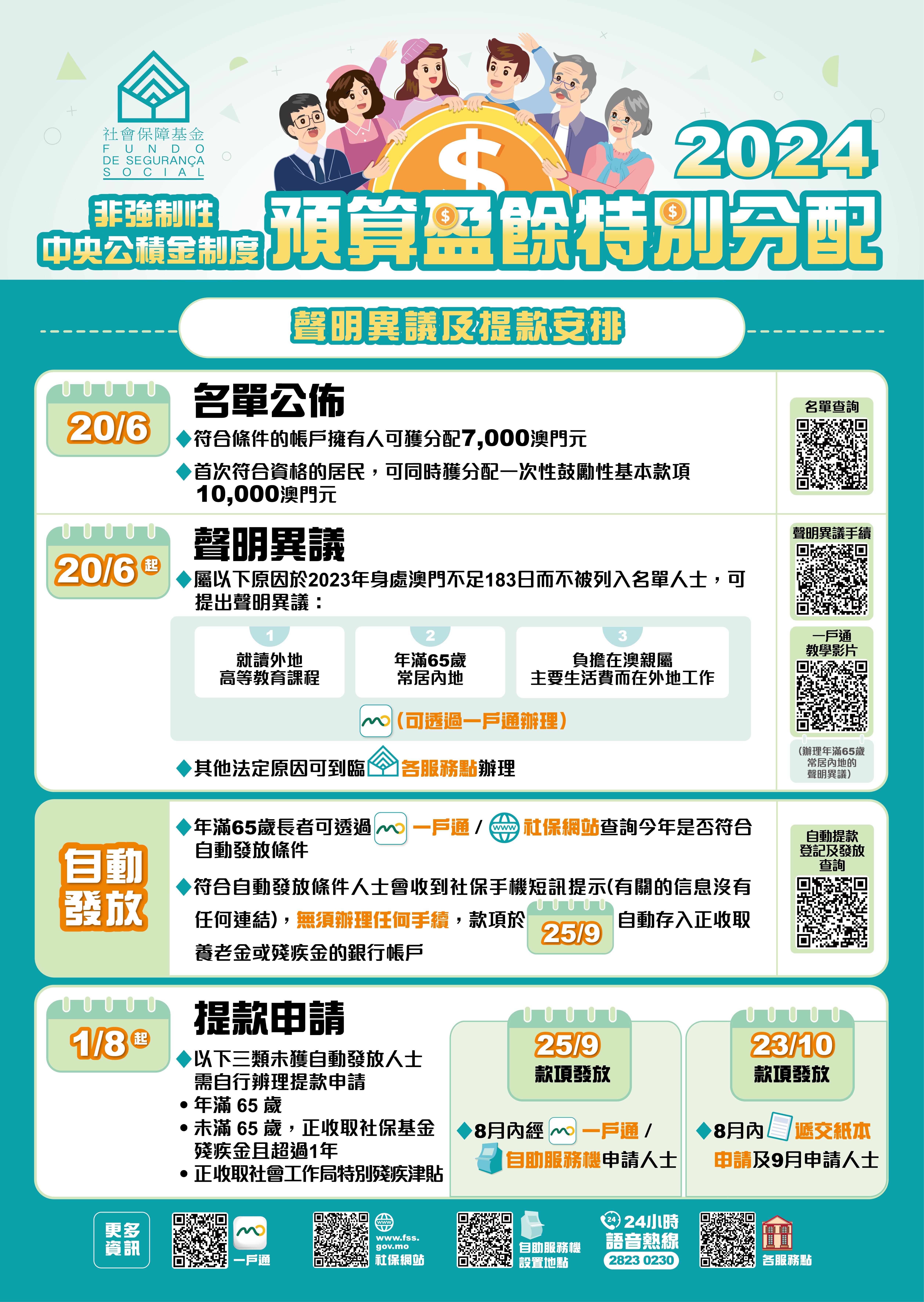 被列入名單人士可獲分配7,000澳門元,無須辦理任何手續;如為首次獲分配款項,將同時獲分配一次性鼓勵性基本款項10,000澳門元。2023年內年滿22歲且至少有183日身處澳門的永久性居民,2024年1月1日仍在生,可被列入2024年度預算盈餘特別分配款項名單。不被列入名單但屬相關法律規定的情況可提出聲明異議,其中就讀外地高等教育課程、年滿65歲常居內地及因負擔在澳親屬生活費而在外地工作人士可透過“一戶通”辦理聲明異議,其他原因則可前往各服務點辦理。為依法保障澳門居民於橫琴粵澳深度合作區的各項社保權益,2023年3月1日或以後,因前往深合區學習、就業、創業及生活等情況,可納入“人道或其他適當說明理由”對撥款名單提出聲明異議。另外,提出獲得2024年度款項權利的時效為3年,即有關權利將於2027年12月31日屆滿,逾期則失效。