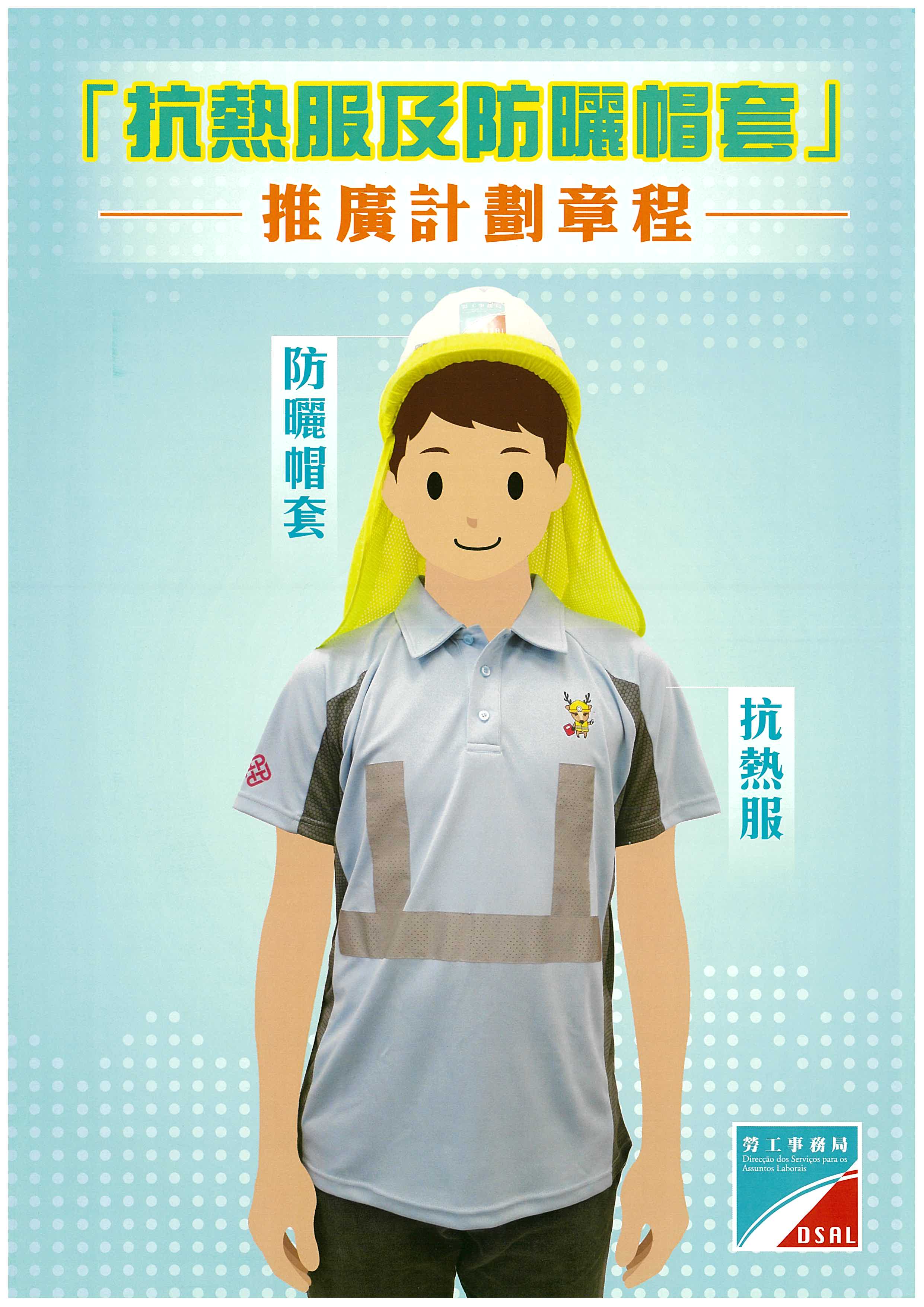 勞工局正推出「抗熱服及防曬帽套」及「便攜式掛腰風扇」推廣計劃,以及備有預防中暑的海報,歡迎巿民索取和張貼於工作場所。如欲獲取更多職安健資訊,歡迎瀏覽勞工局職安健天地網頁www.dsal.gov.mo,亦可致電28717781或電郵dsaldsso@dsal.gov.mo查詢。