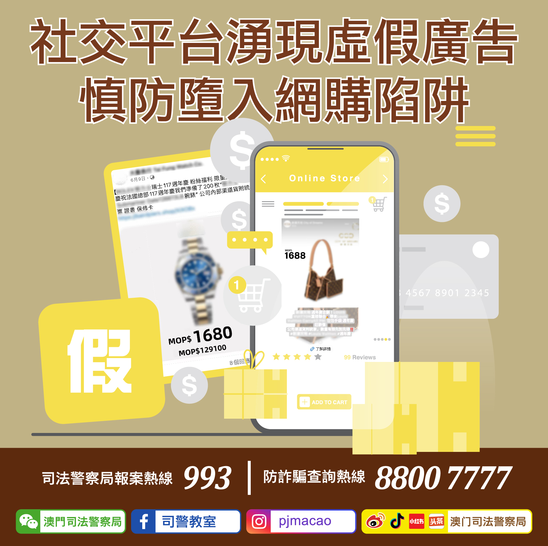 3. 如有懷疑,可使用司警局“反詐程式"查詢風險指數或上報資料,又或致電司警局防詐騙查詢熱線88007777或報案熱線993求助。
