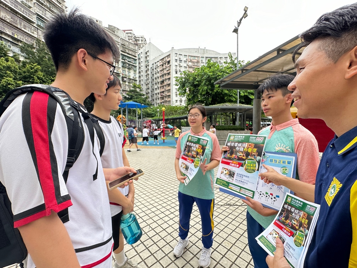 6月15日至21日期間,司警局關注少年組人員聯同多間學校的代表、兩項青年計劃學員,分別前往本澳各區學校周邊、公園、休憩區、運動場及自由波地等地點派發宣傳單張,向青少年傳遞防罪訊息,尤其有關“睇波不賭波”以及切勿參與非法博彩的資訊,冀能透過朋輩影響力,將防罪拒賭訊息於青少年群體中廣作傳播,提升他們的知法守法意識。