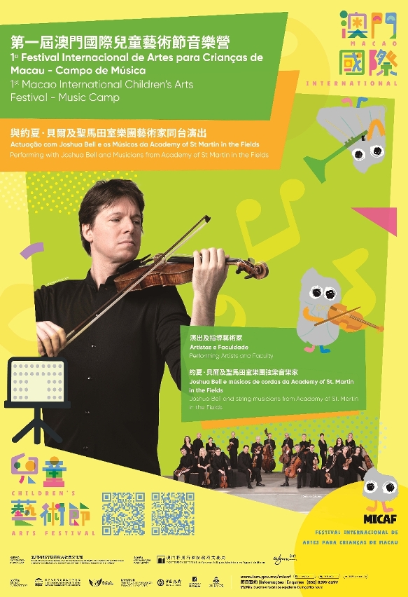 為拓展本地年輕音樂學子的藝術視野,由文化局、永利渡假村(澳門)股份有限公司共同主辦、澳門樂團有限公司製作的“第一屆澳門國際兒童藝術節音樂營”,將於8月16至21日舉行。曾獲格林美獎的國際小提琴大師約夏・貝爾(Joshua Bell)及聖馬田室樂團多位弦樂藝術家,將來澳舉辦弦樂音樂營,參加者除可獲一對一指導外,更可與藝術家組成弦樂團,以及有機會與約夏・貝爾同台演出,機會難逢。音樂營現正進行公開招募,歡迎8至18歲青少年報名,並提交演奏影片作甄選之用。