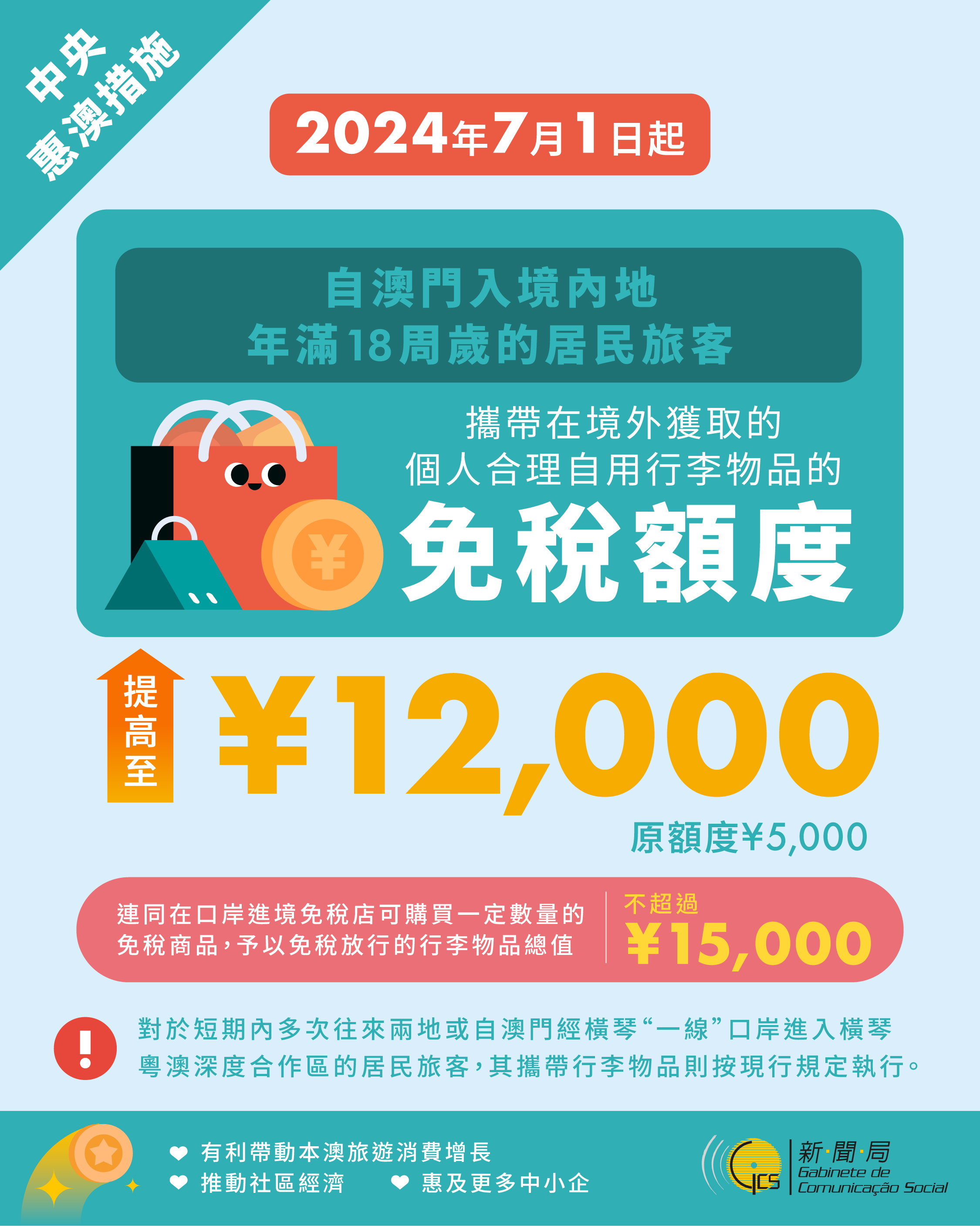 【圖文包】中央惠澳措施 - 提高自澳門入境內地的居民旅客攜帶自用行李物品之免稅額度