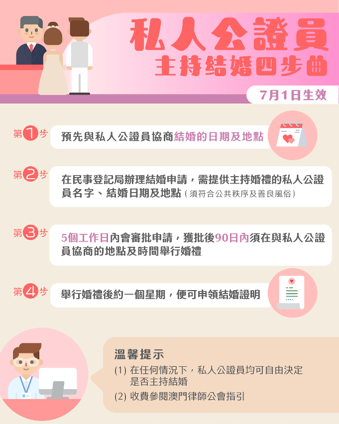 居民在結婚申請獲批後,除在民事登記局辦理結婚登記外,亦可由私人公證員在民事登記局以外地方主持結婚。