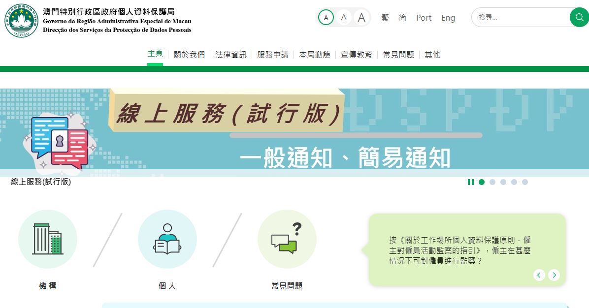 為配合特區政府電子政務的發展,個人資料保護局(下稱個資局)增設線上服務系統,協助公、私營機構或市民更好地履行第8/2005號法律《個人資料保護法》規定的通知義務。
