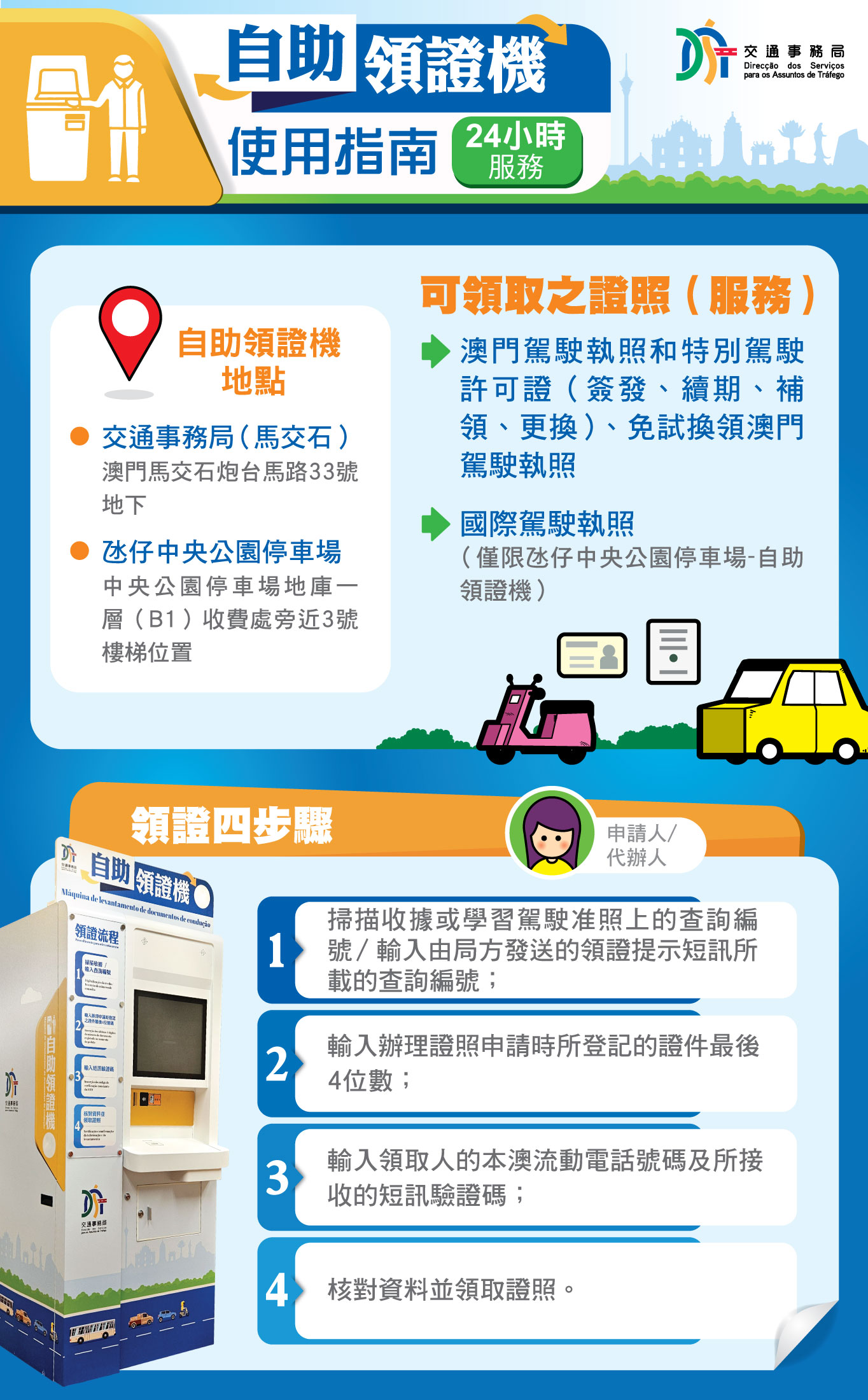 除增加自助領證地點外,局方亦擴展自助領證計劃的服務範圍。同日起,申請人無論於線上(可參考https://www.dsat.gov.mo/dsat/lic_services_photo_doc.aspx)或線下辦理涉及澳門駕駛證照的相關服務,包括通過駕駛考試合格所新簽發的駕駛證照,以及續期、更換或補發駕駛證照,均可自行選擇透過該兩部自助領證機24小時自助領取。但設於馬交石的自助領證機暫未能領取國際駕駛執照,敬請市民留意。
