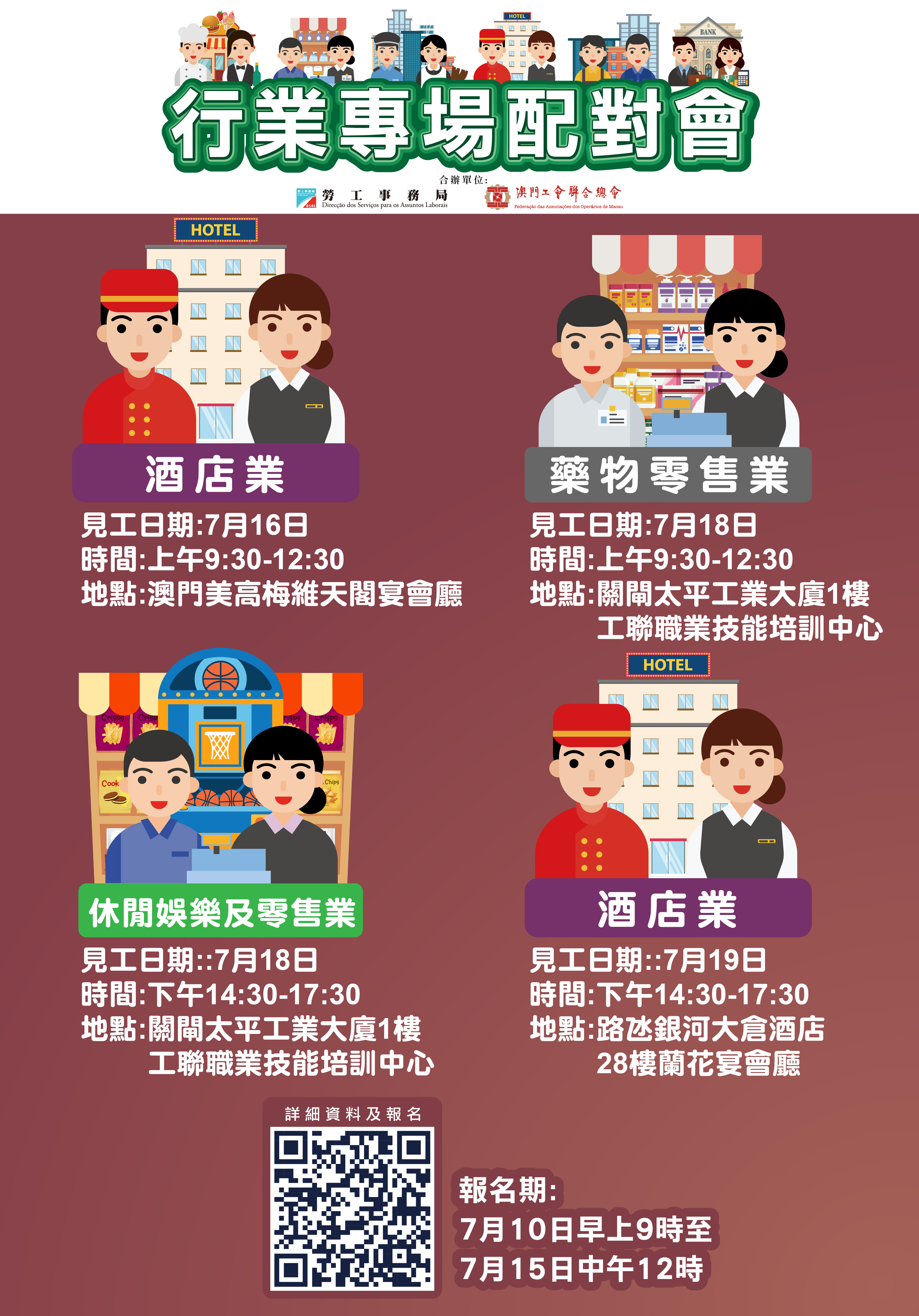 7月16日上午酒店業配對會在澳門美高梅維天閣宴會廳舉行;7月18日上午藥物零售業配對會及下午休閒娛樂及零售業配對會在澳門工聯職業技能培訓中心(關閘馬路101-105A號太平工業大廈第一期1樓)舉行;7月19日下午酒店業配對會在澳門大倉酒店28樓蘭花廳舉行。報名日期為7月10日上午9時至7月15日中午12時。