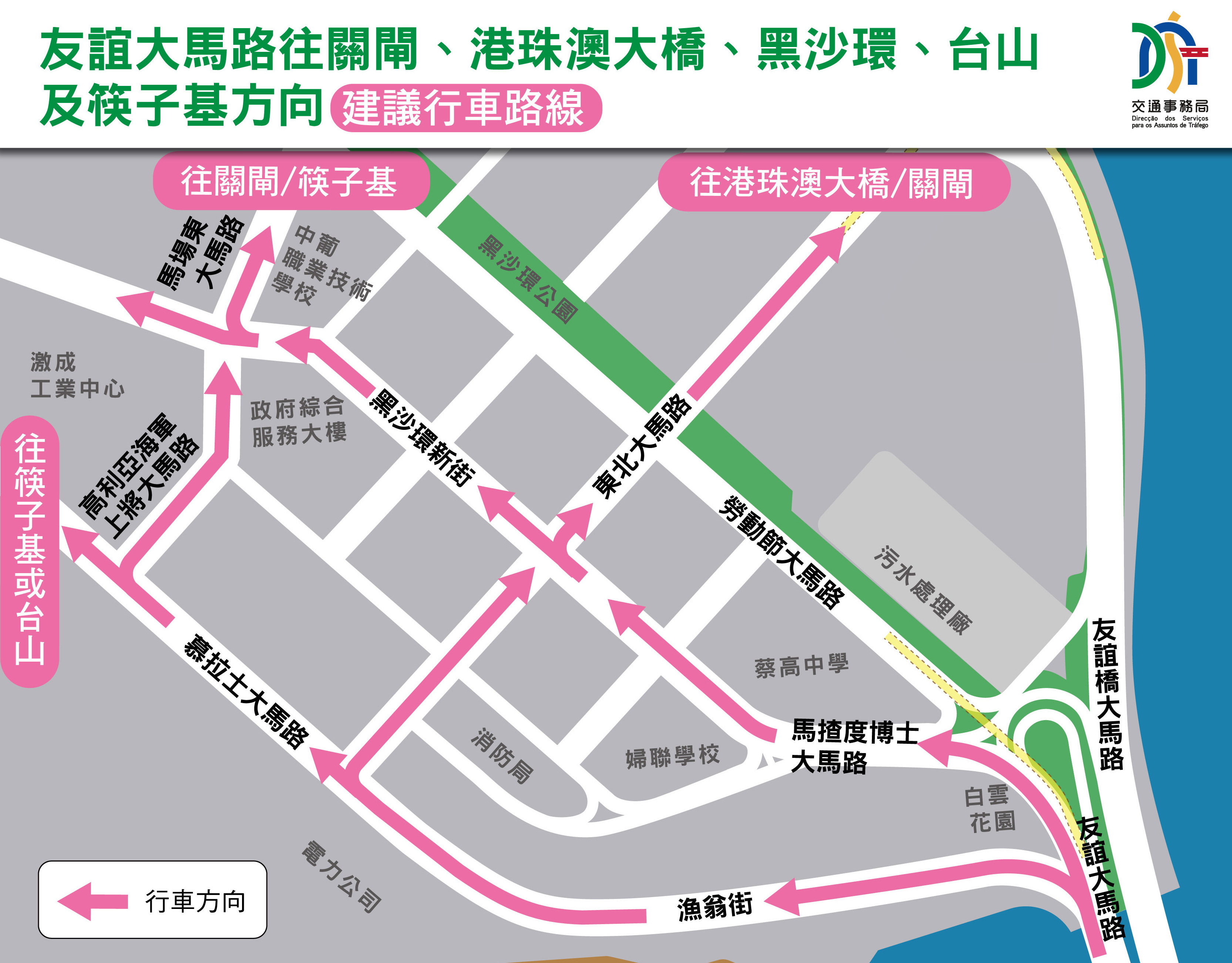 考慮到友誼橋大馬路車流量大,交通事務局提早透過道路工程協調機制,與區內各工程主管單位協調施工安排,避免多條主幹道路同步施工,緩減不同工程疊加對交通的影響。局方並已協調博企員工巴及穿梭巴士取道漁翁街,同時呼籲重型貨車於平日繁忙時段避免進入該區一帶道路,而欲前往港珠澳大橋及北區的車輛亦建議改道行駛。