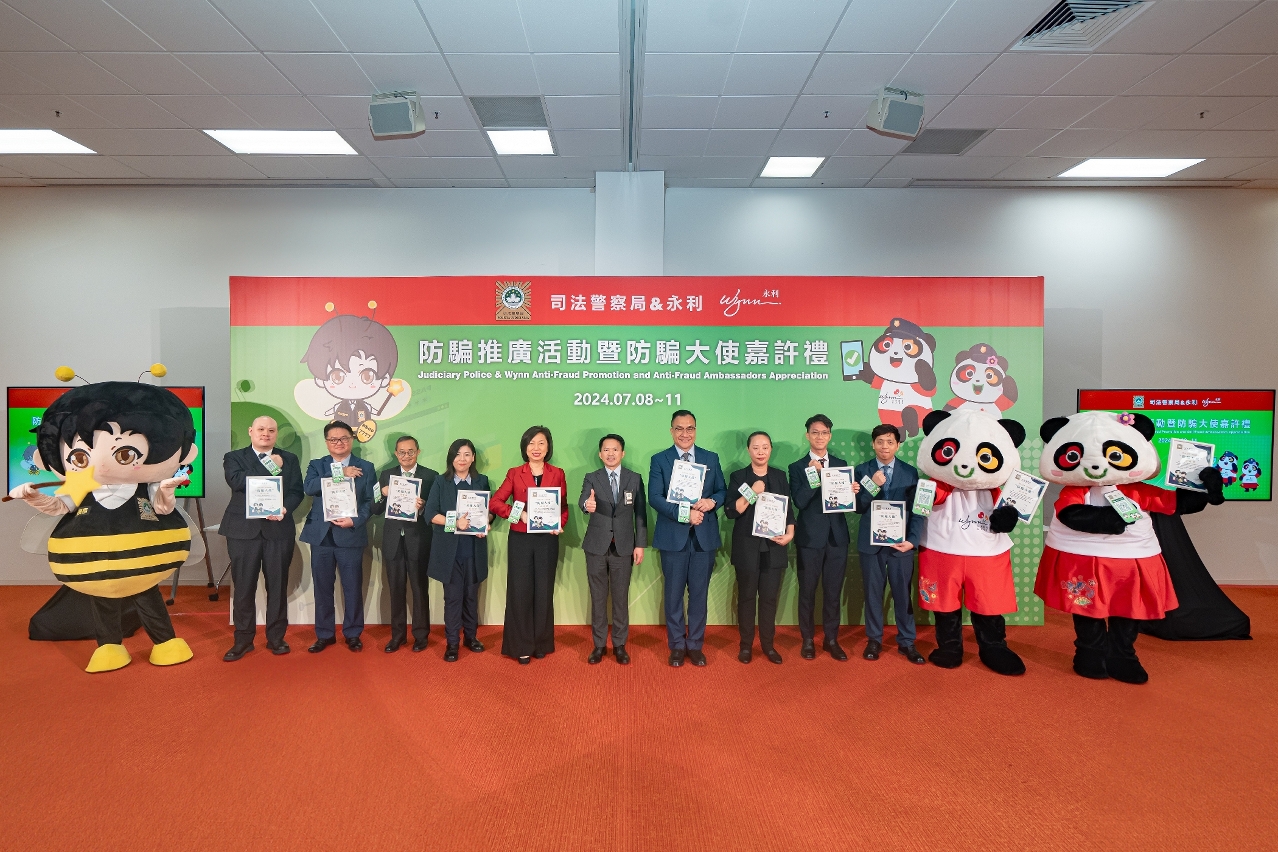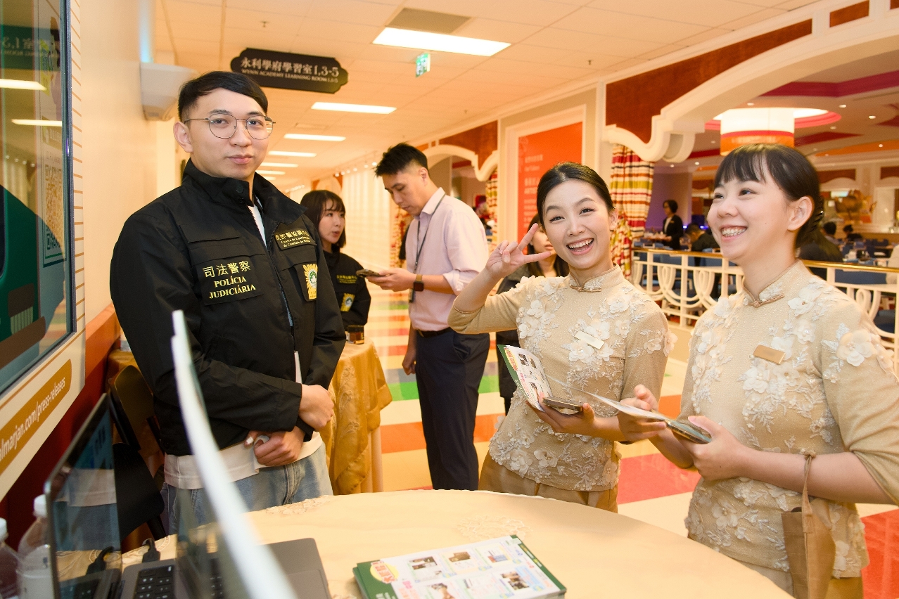 近年來部分旅遊博彩業從業員不慎墮入電訊及網絡詐騙陷阱,為切實增強業界的防範意識及能力,司法警察局應永利渡假村(澳門)股份有限公司邀請,日前共同合辦“永利防騙推廣活動暨防騙大使嘉許禮”,並在該企業旗下各娛樂場後勤區設置防騙互動體驗及攤位遊戲,吸引逾2,400名員工到場瞭解最新防騙資訊。活動上,司警局向8人授予“防騙大使"榮譽稱號,以助局方在企業內部宣揚防騙訊息。