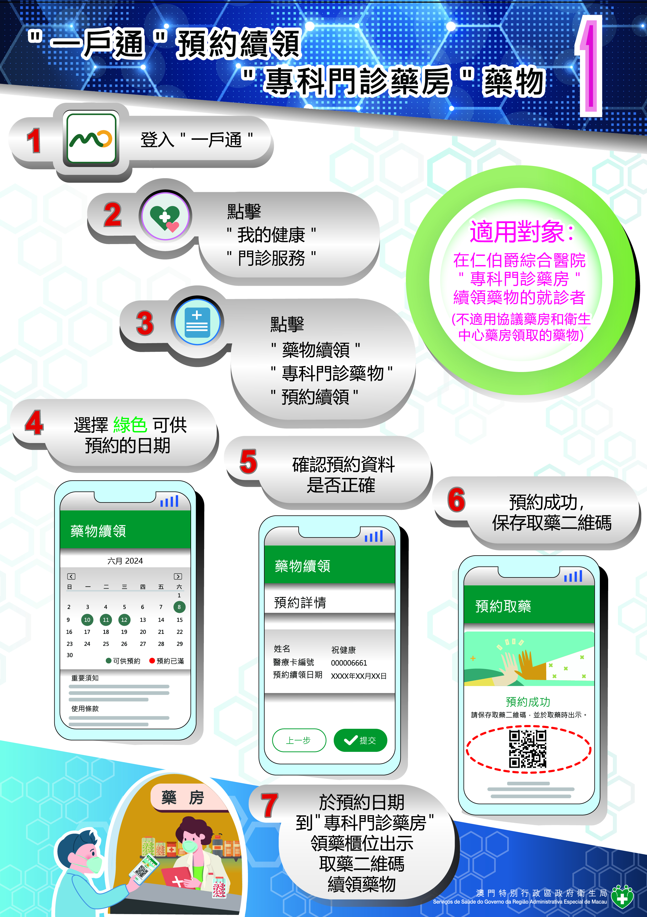 為配合特區政府電子政務發展,推動智慧醫療,進一步便利就診者或代領人領取仁伯爵綜合醫院專科門診藥物和縮短輪候領藥時間,衛生局於7月23日起優化“一戶通”預約續領“專科門診藥房"藥物服務,包括延長可續領藥物的日期及預約時間,具體如下:
