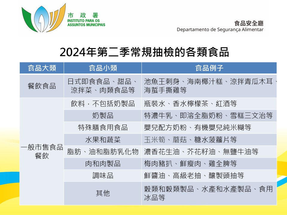 第二季抽檢的537個食品樣本中,包括308個一般市售食品樣本和229個餐飲食品樣本,抽檢點涵蓋本澳各區餐廳、酒樓、食肆、外賣店、超級巿場、凍肉店、雜貨店及藥妝店等。市政署對相關食品樣本進行了檢測,當中微生物檢測項目包括沙門氏菌屬、單核細胞增生李斯特氏菌、蠟樣芽孢桿菌及銅綠假單胞菌等常見致病菌;化學檢測項目包括重金屬、禁用物質、食品添加劑及真菌毒素等。