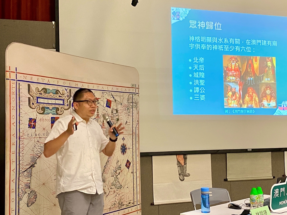 林翊捷主講“水村山郭—水神與祂們的聚落”,由人類賴以維生的“水”掀開序幕,雨水、井泉、江河和海洋,不論對航海或農業的民族皆影響深遠,在科技不發達的時代,人們對水虔誠祭拜,祈求風調雨順、國泰民安。澳門作為沿海城市,海洋文化深植其中,這個城市多元的宗教信仰中,有不少與水有關的神祇,有多座廟宇的主神屬於“水神”。講者以豐富的地圖和照片,暢談澳門的水神廟宇,探討其建成的時期、所在的位置與座向,以至供奉的神祇,這些細節一方面見證了昔日的海岸線,而不同水神的“神格”,亦反映了不同華人族群的特點。