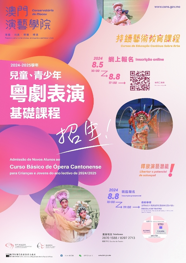 為培育本地粵劇藝術傳承人才,讓更多兒童、青少年投身學習粵劇表演,2024/2025學年“兒童、青少年粵劇表演基礎課程”將招“基礎一級平喉”及“基礎一級子喉”學員,對象為年齡9至13歲的澳門居民,名額有限,有意者可於8月5日(星期一)上午10時至8月8日(星期四)下午5時,登入網頁www5.icm.gov.mo/consreg/cmt 進行網上報名,或於8月8日(星期四)上午10時至晚上7時親臨澳門演藝學院戲劇學校(澳門友誼大馬路海景花園新安花園87號U)報名,詳情可瀏覽澳門演藝學院網頁(www.cons.gov.mo)或於辦公時間致電2870 1588查詢。