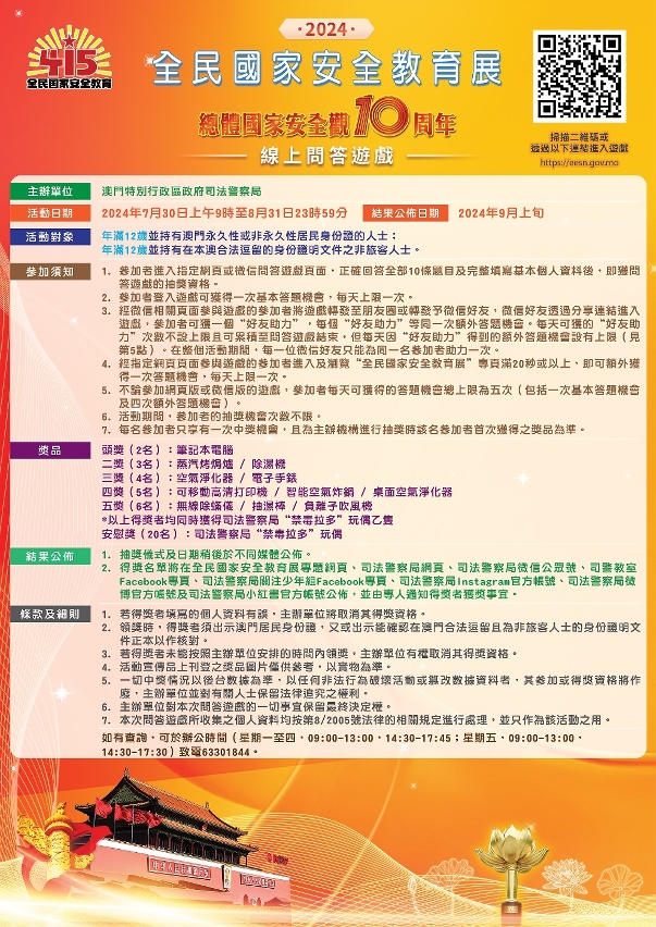 參加問答遊戲的人士必須為年滿12歲,且為本澳居民或持合法逗留許可之非旅客人士。參加者可透過登入“全民國家安全教育展”專題網站(https://eesn.gov.mo)或掃描活動章程內的二維碼進入遊戲頁面,每天獲取1次答題機會,正確回答10題問題並填妥個人資料後即可參加抽獎。參加者還可通過轉發予微信好友獲取“好友助力”、瀏覽“全民國家安全教育展”專題網站滿20秒,每天獲得最多4次額外答題機會。在整個活動期間,每一位微信好友只能為同一名參加者“助力”一次。參加抽獎次數不限,但僅得一次中奬機會。遊戲內的問題主要圍繞“2024全民國家安全教育展”展覽內容,參加者可瀏覽專題網站回顧展覽詳細資訊。