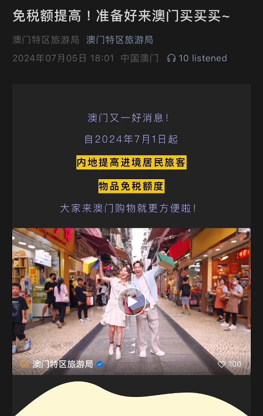 【旅遊局】旅遊局製作短片宣傳內地提高自澳門進境居民旅客攜帶行李物品免稅額度措施