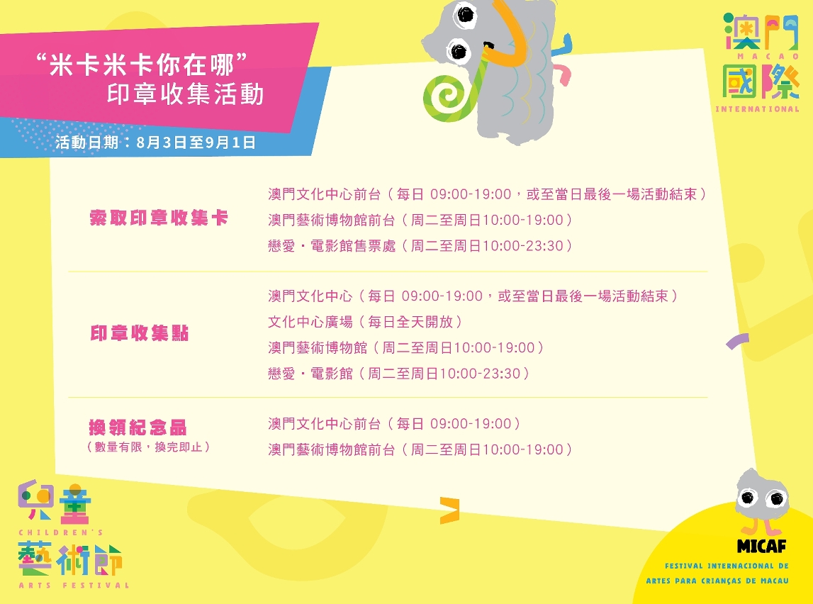 8月3日起至9月1日將設印章收集活動“米卡米卡你在哪”,大小朋友可於開放時間在澳門文化中心、澳門藝術博物館或戀愛‧電影館任一地點索取印章收集卡乙張,其後前往設於澳門文化中心、文化中心廣場、澳門藝術博物館和戀愛‧電影館的“印章收集點”,集齊其中三處的印章,即可到澳門文化中心前台或澳門藝術博物館前台換領紀念品乙份。紀念品數量有限,換完即止。主辦單位冀藉著有關活動鼓勵觀眾親自到多個活動舉辦地點遊玩,參與國際兒童藝術節的多元活動。