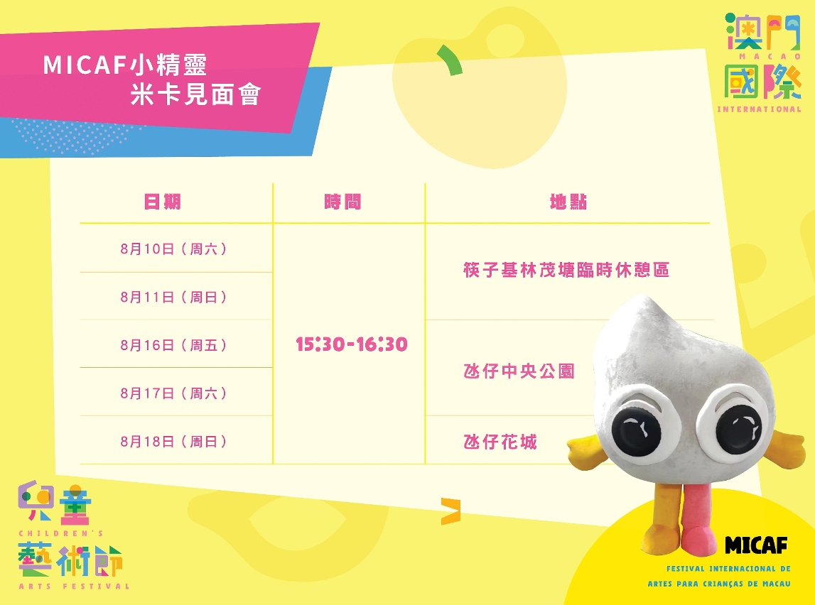 活潑好動喜愛結交新朋友的小精靈米卡亦將聯同一班好友舉行“MICAF小精靈米卡見面會”,分別在筷子基林茂塘臨時休憩區(8月10日至11日)、氹仔中央公園內(8月16日至17日),以及氹仔花城(8月18日)現身,在上述日期的下午3時30分與現場觀眾互動,以及跳舞助興,同場亦設有紀念品攤位,一同歡度國際兒童藝術節。