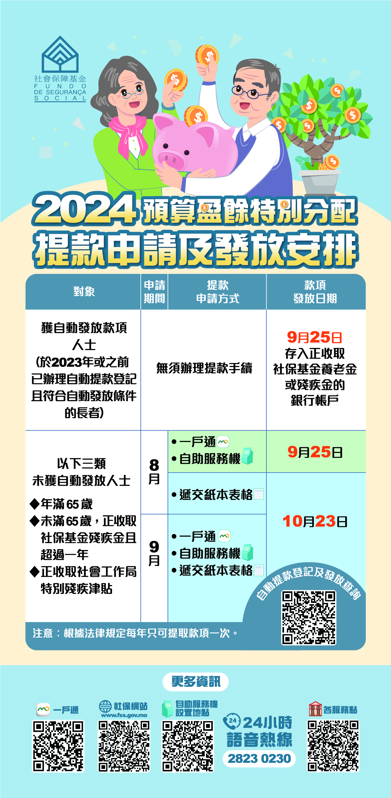 社會保障基金提醒未辦理自動提款登記的人士,可於今年作提款申請的同時辦理登記,翌年起如有預算盈餘特別分配而又符合自動發放條件,無須辦理任何手續,款項會自動存入其正收取養老金或殘疾金的銀行帳戶,省時便捷。居民可隨時透過“一戶通”及社保基金網站的專題網頁查詢自己是否已辦理自動提款登記,及是否符合當年款項的自動發放條件。