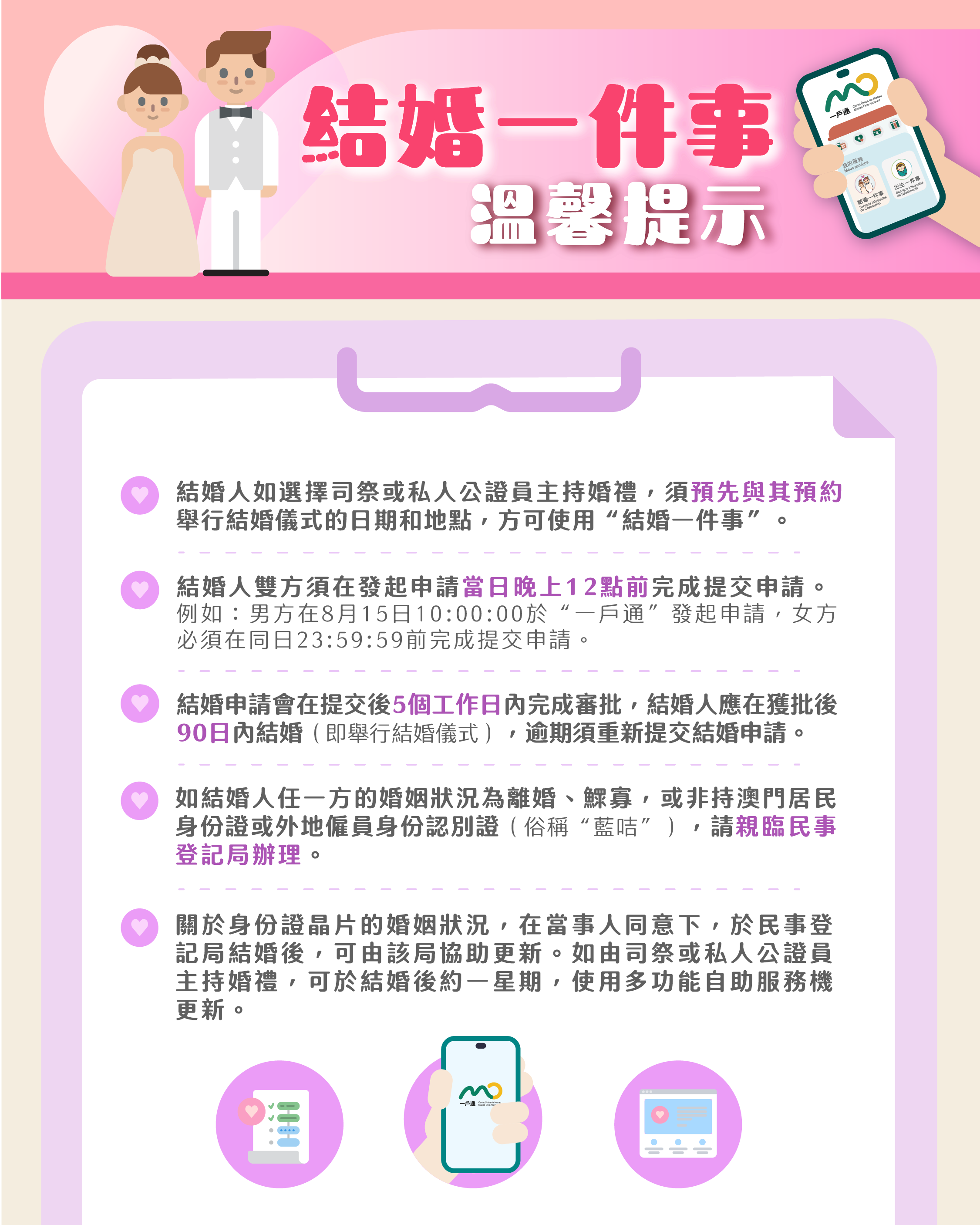 合資格結婚人可透過“結婚一件事”辦理包括結婚申請、預約結婚日期、更新身份證婚姻狀況以及申請結婚津貼的服務,而結婚人還可以選擇由民事登記局登記官、教堂的司祭或者私人公證員主持結婚。此外,如果結婚人選擇由登記官主持結婚,在登記當天便可更新澳門居民身份證的婚姻狀況,並領取結婚證明。“結婚一件事”讓結婚人一次完成辦理多項與結婚相關的行政手續,無需多次前往不同部門。