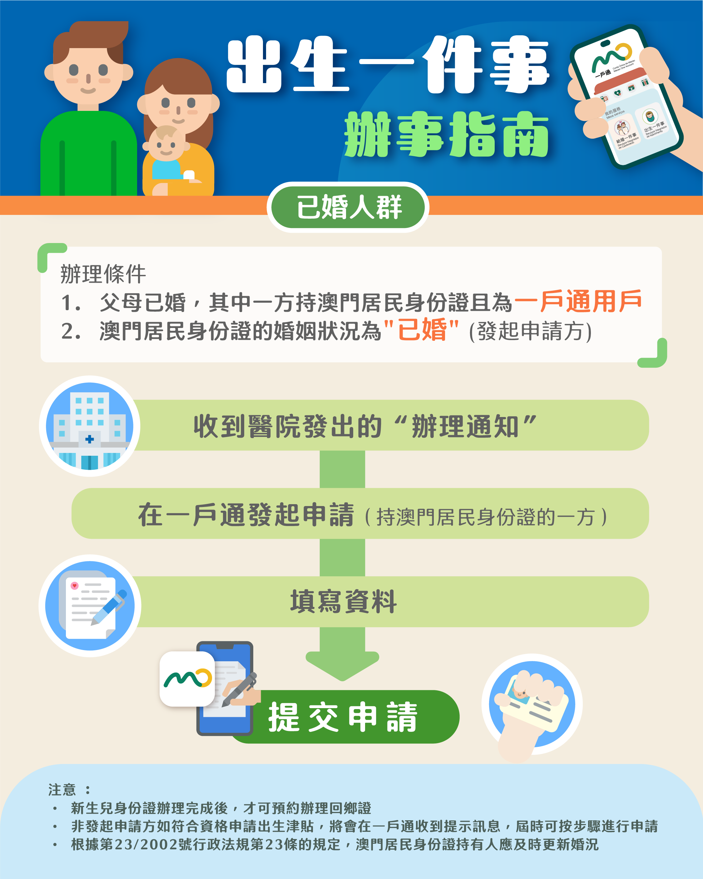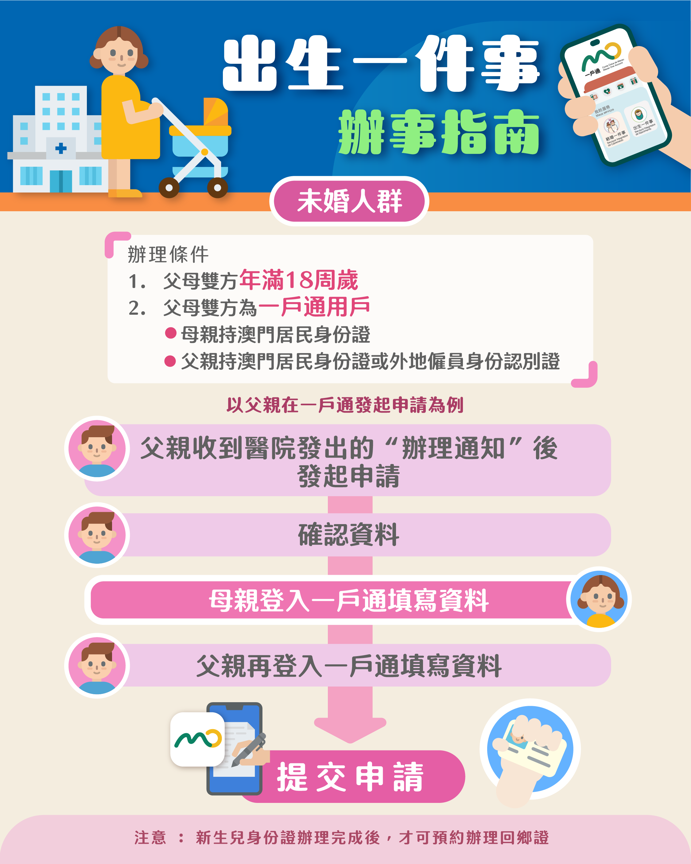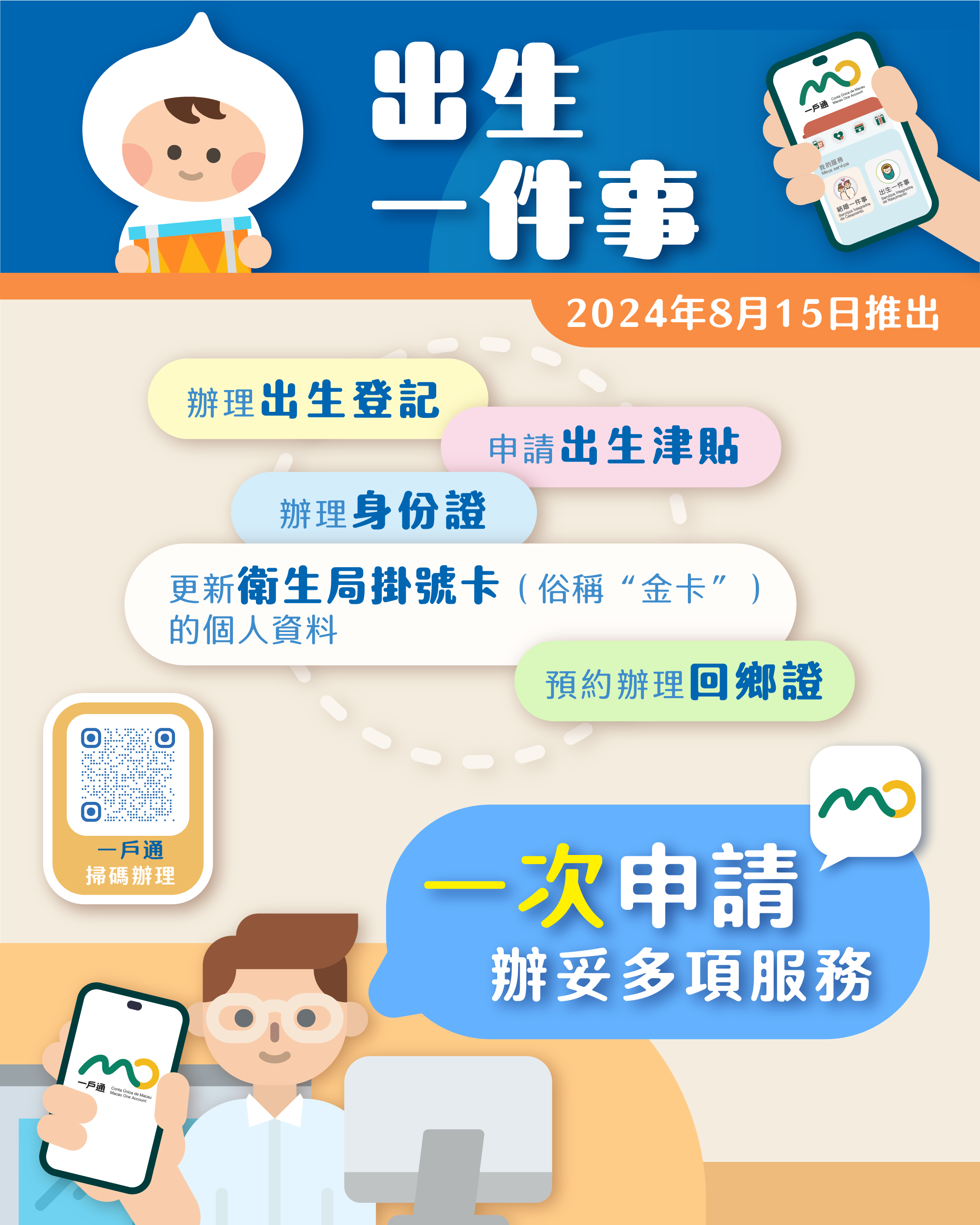 合資格的新生兒父母在接獲醫院發出的“辦理通知”(載有可辦理出生登記的日期)後,立即可透過“出生一件事”辦理包括出生登記、辦理新生兒身份證、更新衛生局掛號卡(俗稱“金卡”)的個人資料、申請出生津貼以及預約辦理回鄉證的服務。“出生一件事”讓父母一次辦妥與新生兒出生相關的多項服務,減少親臨部門提交資料的次數,加快辦理新生兒出生文件的速度。