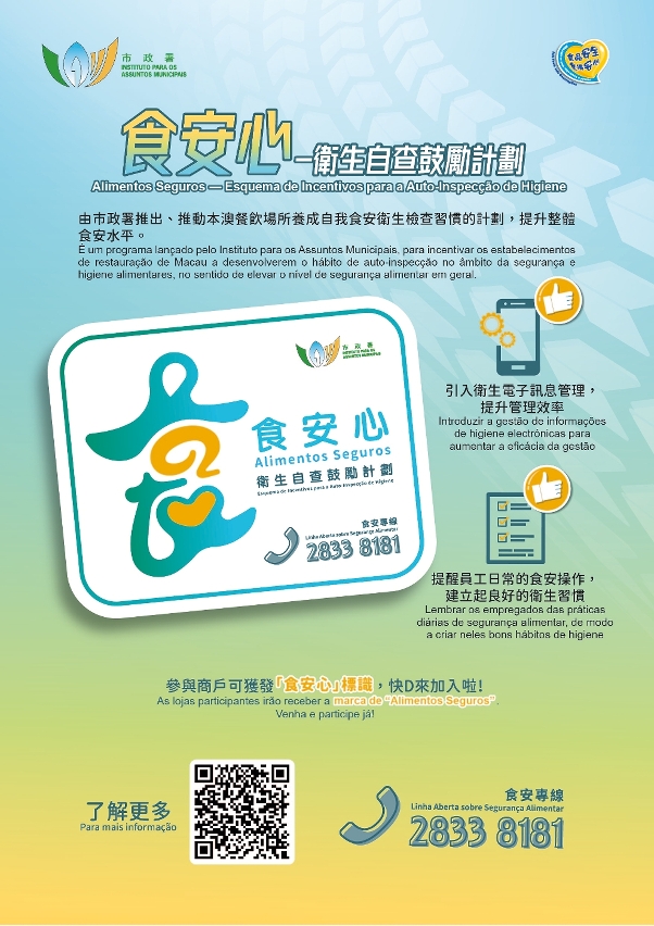 為提升食品業界對食品安全的認知及衛生水平,市政署每月開辦“食品安全與環境衛生基礎班”。八月份課程將於八月二十九日(星期四)舉行,課程約兩小時,費用全免,完成課程者可獲發證明書,歡迎業界踴躍報讀。員工完成修讀課程後,其所屬的食品場所即可參與 “食安心─衛生自查鼓勵計劃”,共同推動企業自我食安衛生檢查習慣,長遠提高整體衛生管理水平和食品安全形象。