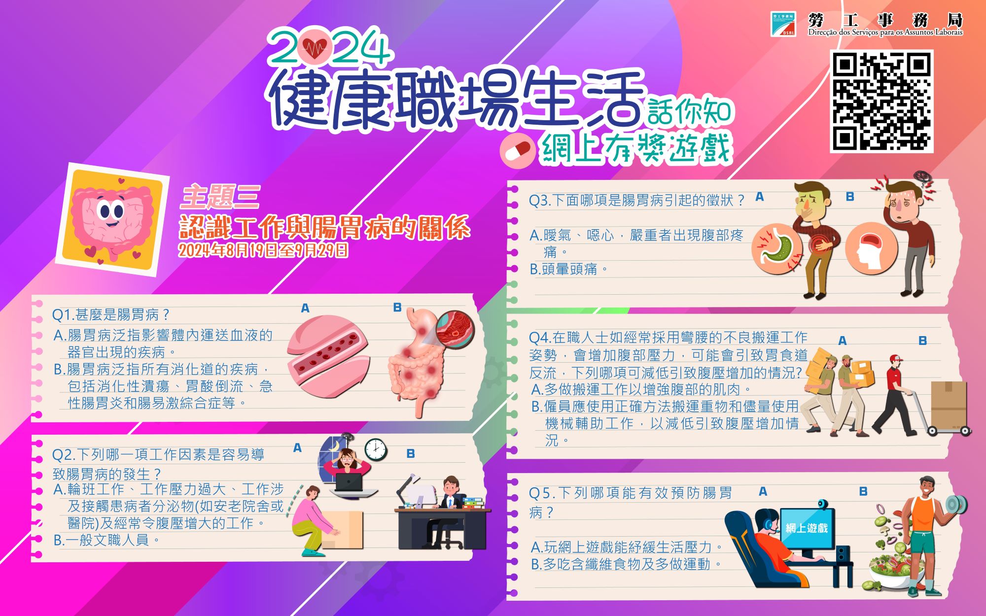 為持續提升市民對職業健康的關注,勞工局由8月19日起至9月29日期間推出第三期有奬遊戲,主題為“認識工作與腸胃病的關係”。歡迎有興趣的市民可透過勞工事務局手機應用程式或掃描二維碼參與。