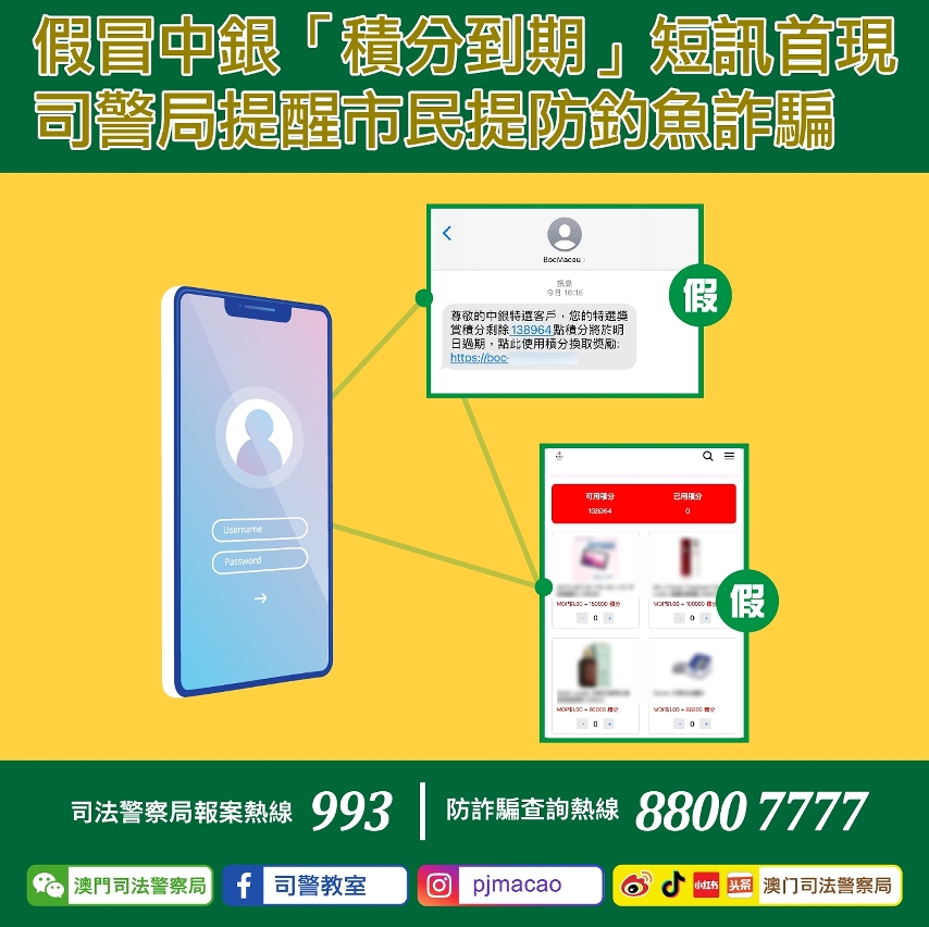 近期本澳相繼出現假冒各大機構之釣魚短訊,司警局反詐騙協調中心再次提醒市民: