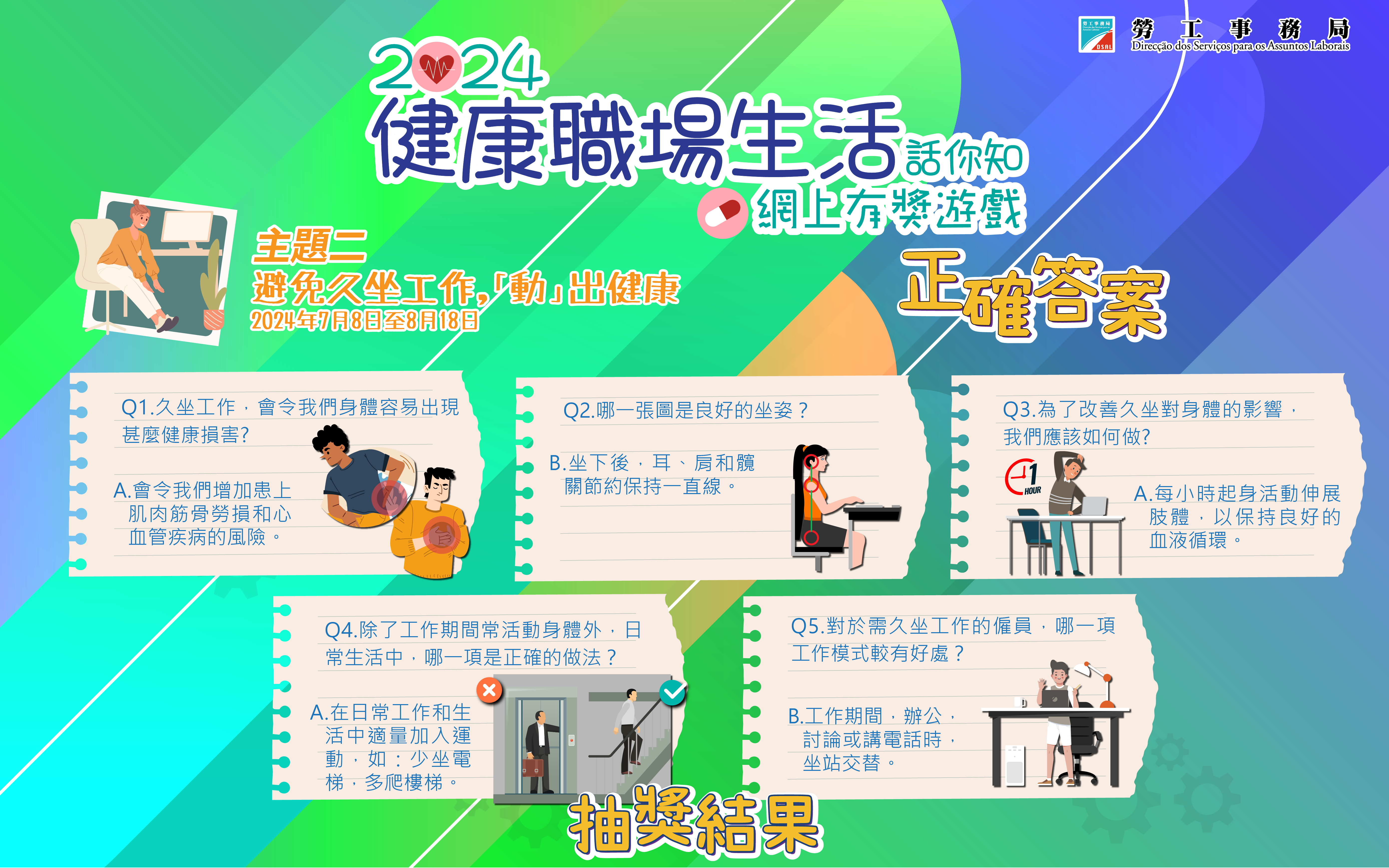 為持續豐富市民的職業安全健康意識,加強對工作安全和健康的關注,勞工事務局舉辦「健康職場生活話你知」有獎遊戲,第二期遊戲主題為“避免久坐工作,「動出健康」”。有關活動已於8月18日結束。是次活動反應熱烈,共有4,144人次參加,當中有3,883人次答對全部問題。勞工局於日前舉行抽獎儀式,隨機抽出30名得獎者,各得獎者可獲得面值100元超市禮券一張,有關得獎者將獲電話短訊通知。