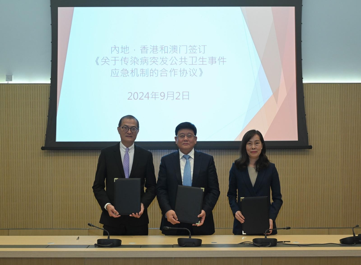 隨後,王賀勝局長、盧寵茂局長、歐陽瑜司長共同簽署了《國家疾病預防控制局、香港特別行政區政府醫務衞生局、澳門特別行政區政府社會文化司關於傳染病突發公共衛生事件應急機制的合作協議》,旨在加強三地在應對重大傳染病突發公共衛生事件領域的合作與交流,按照“一國兩制”原則,根據相關法律、法規,共同應對重大的傳染病爆發流行,切實保障民眾的健康和生命安全,維護社會穩定和經濟持續發展。協議內容主要包括三地應對重大傳染病突發公共衛生事件領域的合作範圍與機構;信息通報、使用和發佈;人員交流與技術培訓;三地應急協調和聯防聯動;科研合作與交流等。
