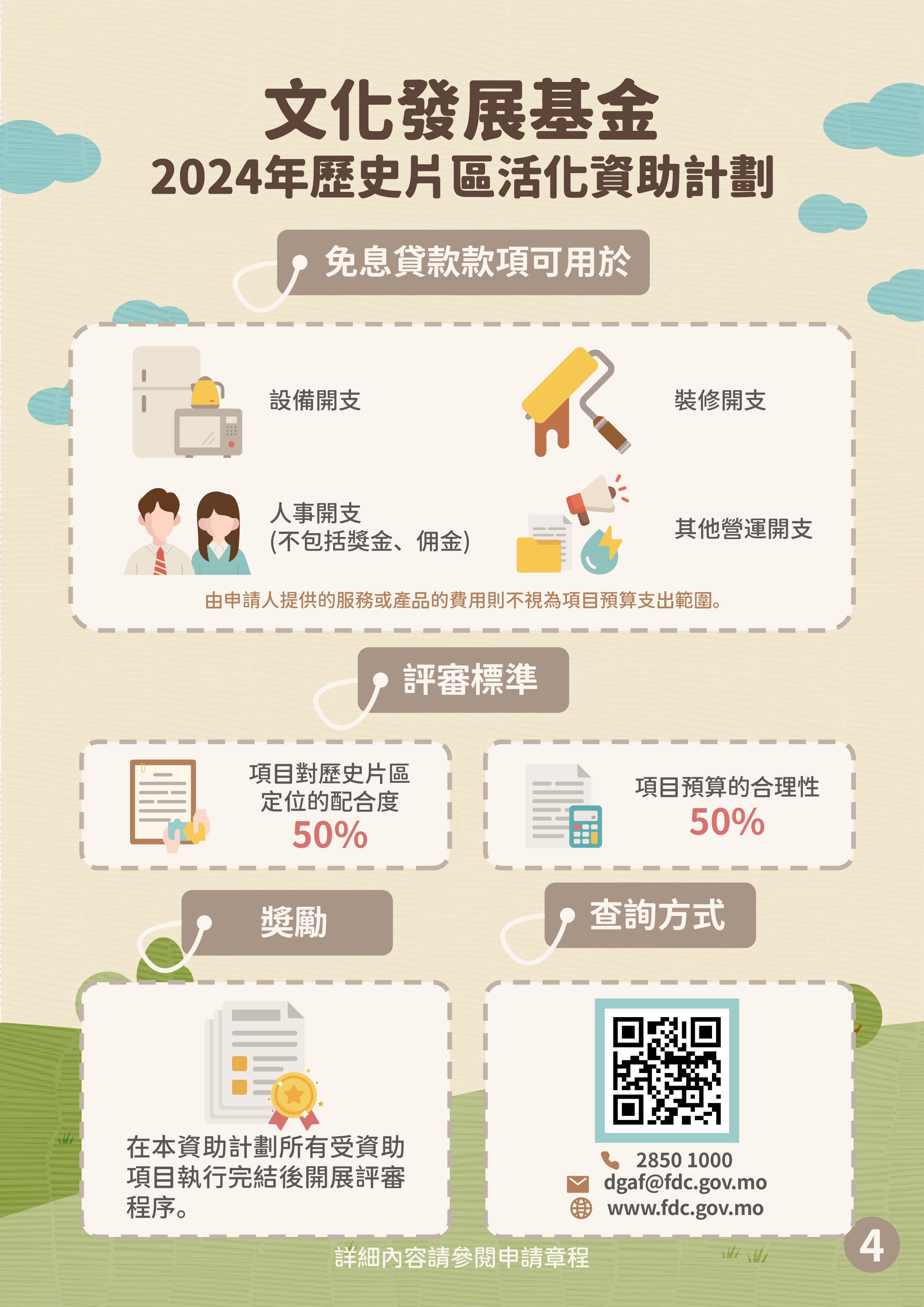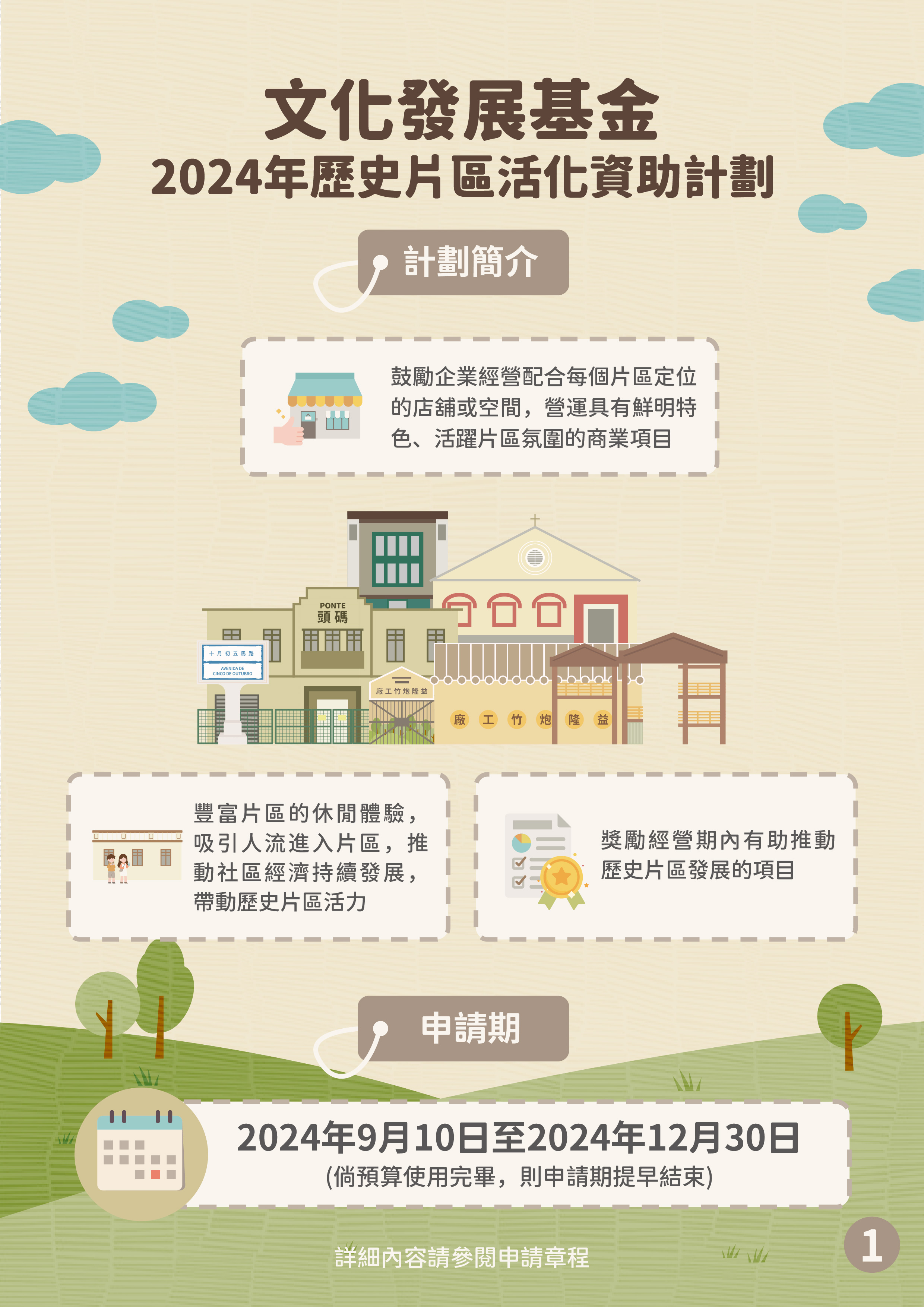 文化發展基金將於9月10日至12月30日接受“2024年歷史片區活化資助計劃”的申請,鼓勵企業經營配合每個片區定位的店舖或空間,營運具有鮮明特色、活躍片區氛圍的商業項目,帶動歷史片區活力,同時獎勵經營期內有助推動歷史片區發展的項目。