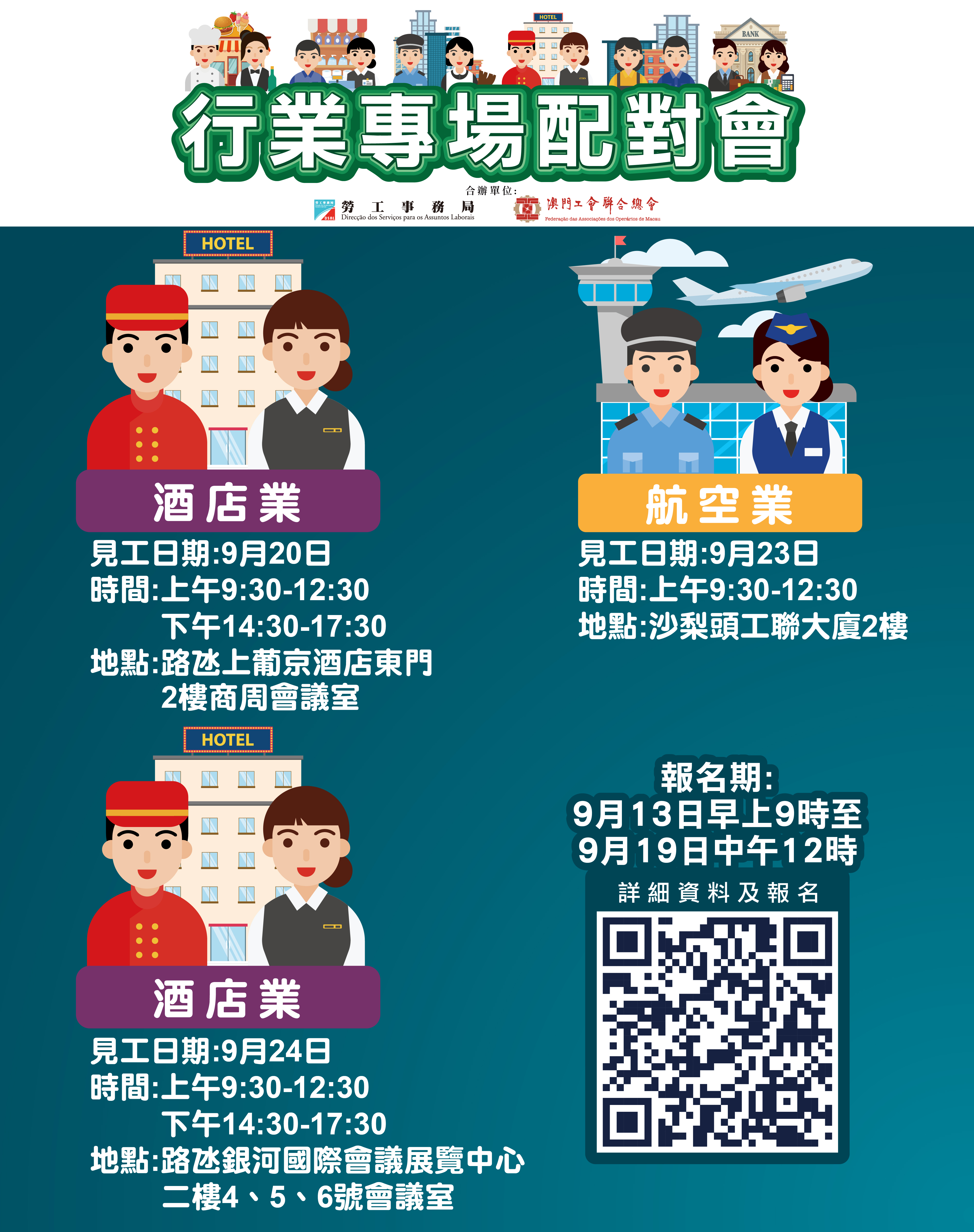 9月24日全日舉辦酒店業配對會,提供365個職位空缺,涉及餐廳助理經理、副總廚、前臺主任、客運統籌主任、花藝技術員、電氣工程師、貴賓司膳服務員、制服服務員、豪華轎車服務司機及餐飲服務員等。配對會在澳門銀河國際會議展覽中心舉行。