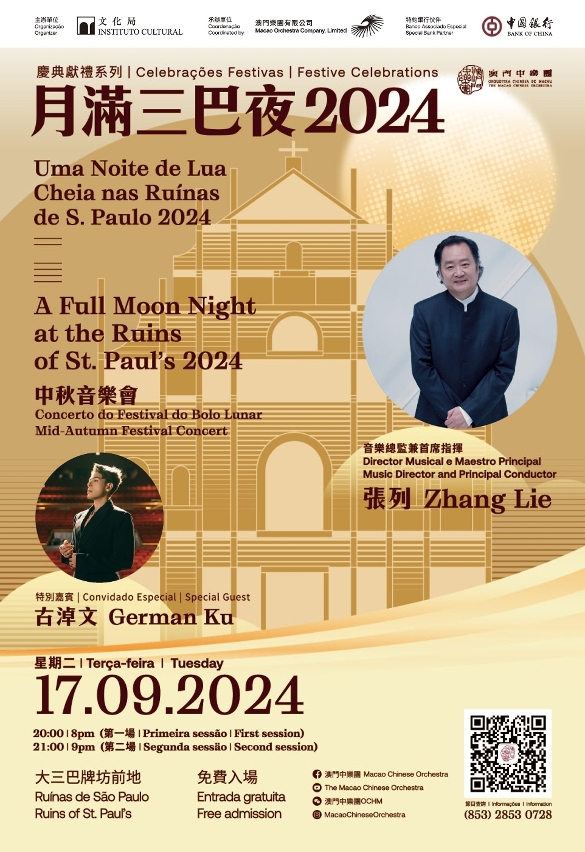 由文化局主辦、澳門樂團有限公司承辦的“月滿三巴夜2024”中秋音樂會,將於9月17日晚上8時及9時在大三巴牌坊上演兩場,澳門中樂團將演奏多首烘托中秋節慶氛圍的中樂名曲,並邀請特別嘉賓古淖文現場獻唱,在中秋夜與市民遊客歡度佳節。