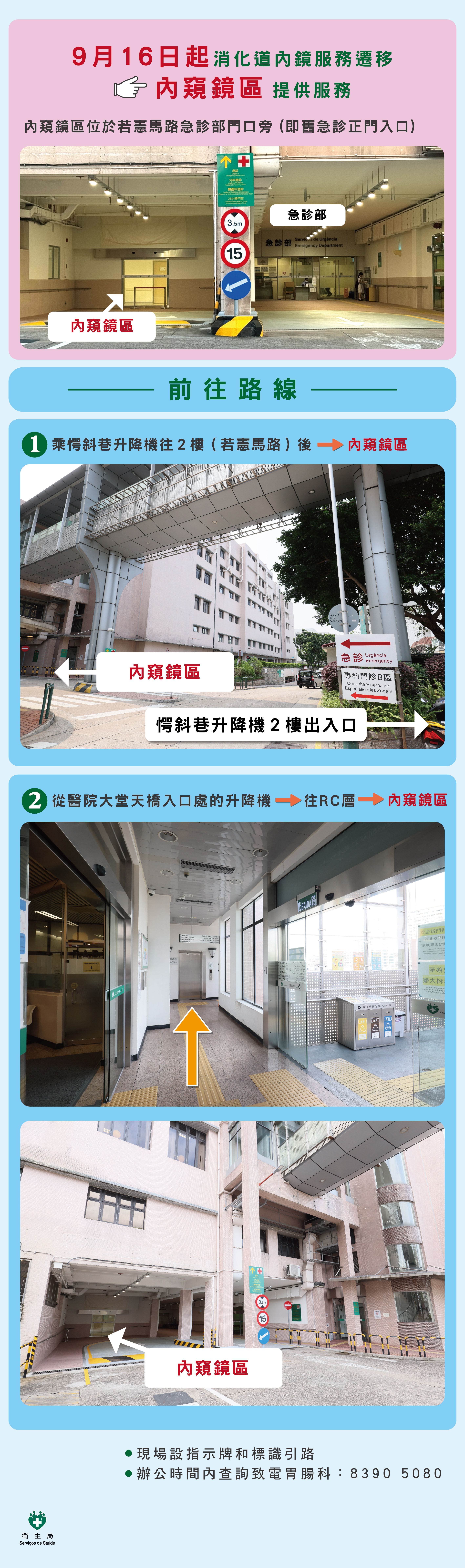 - 原消化道內鏡檢查室設於醫院大堂,現遷移至若憲馬路急診部門口(即舊急診正門入口)旁的內窺鏡區,並將於搬遷日(即9月16日)停止運作;