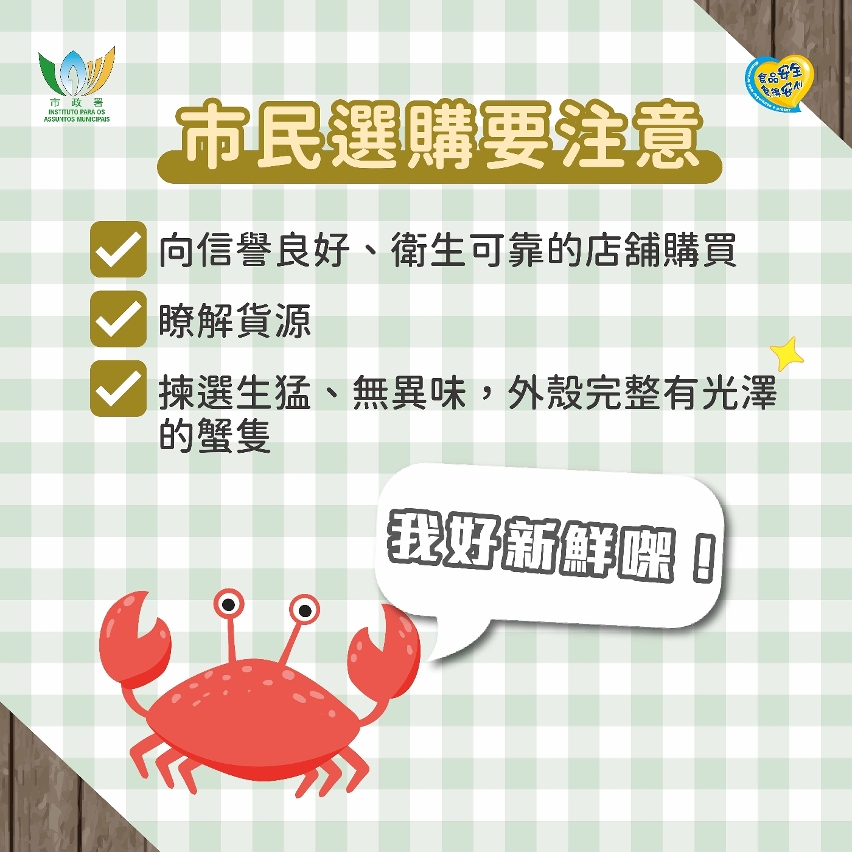 市政署持續透過嚴格的入口檢驗檢疫制度及市場巡查機制,對入口並在本澳銷售的鮮活食品作嚴格把關。市政署與內地權限部門保持緊密聯繫,對供澳大閘蟹的品質及安全,採取源頭監管直接供澳措施。大閘蟹養殖場正式供貨到澳門前,須通過市政署預檢,並由來源場監管當局直接封簽才可輸澳。而大閘蟹抵澳後亦須提交由產地官方發出之衛生證明文件以及相關衛生檢疫資料供審核,並接受常規抽樣,經檢驗檢疫程序後才得以流入本澳市場。