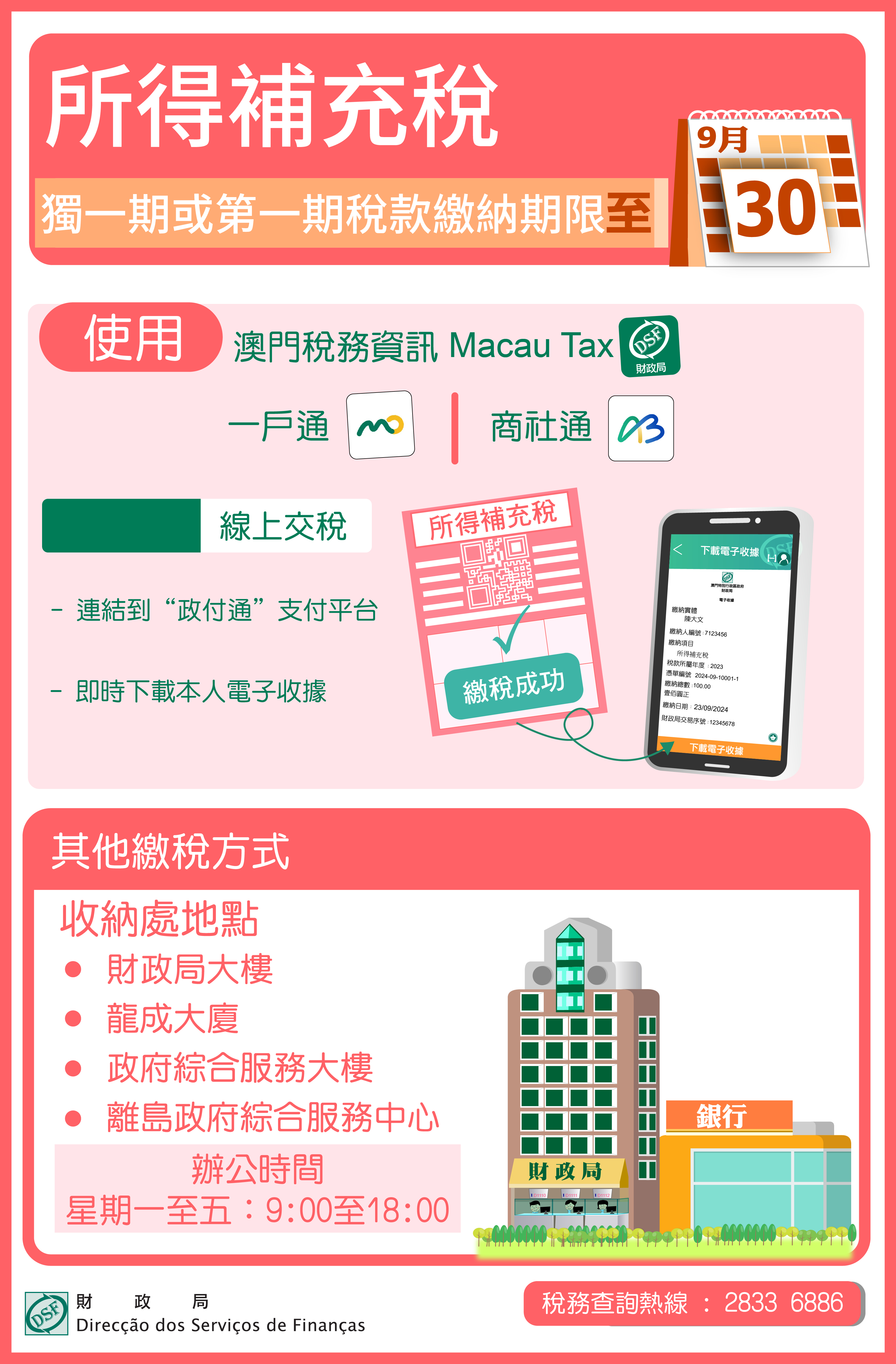 財政局提醒所得補充稅納稅人,繳納月份為9月的獨一期或第一期所得補充稅,繳納期限至9月30日止;倘第一期未於法定期內繳納,將加徵過期利息及欠繳稅款百分之三,並引致第二期繳納期立即到期。