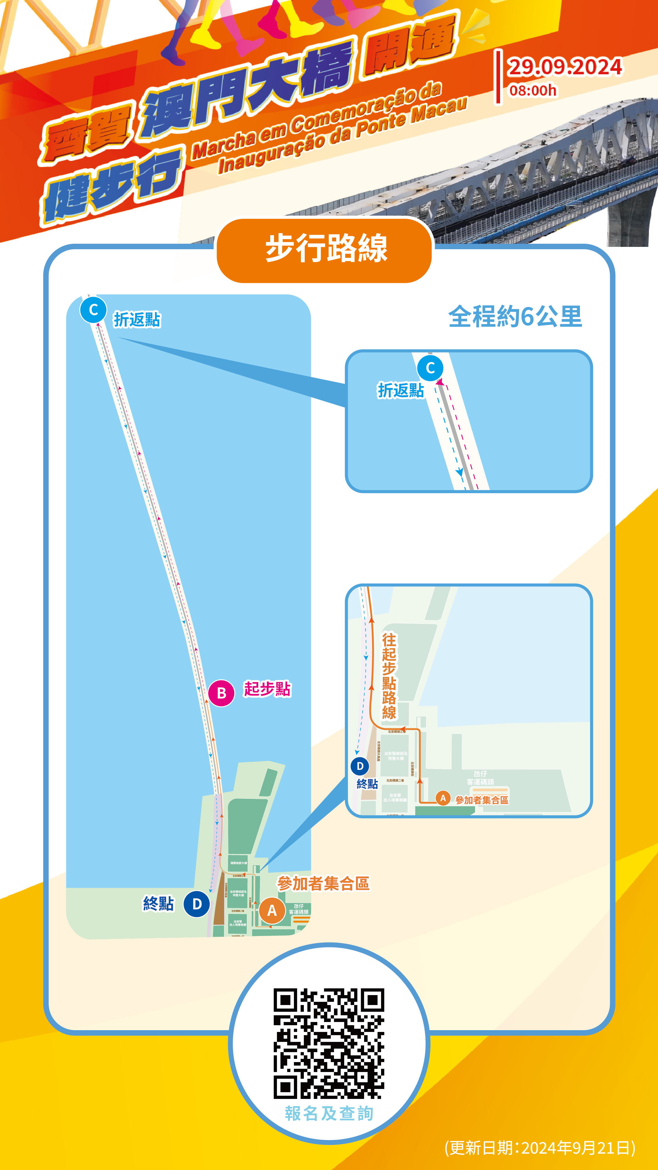 “齊賀澳門大橋開通健步行”活動將於9月29日上午8時舉行,參加者將由澳門大橋連接氹仔北安引橋處出發,行至澳門大橋接近A區引橋的位置再折返至氹仔北安起點,以步行方式走過大橋,全程約6公里。為確保活動安全有序進行,健步行將分成三個時段出發,敬請參加者留意以下時間:
