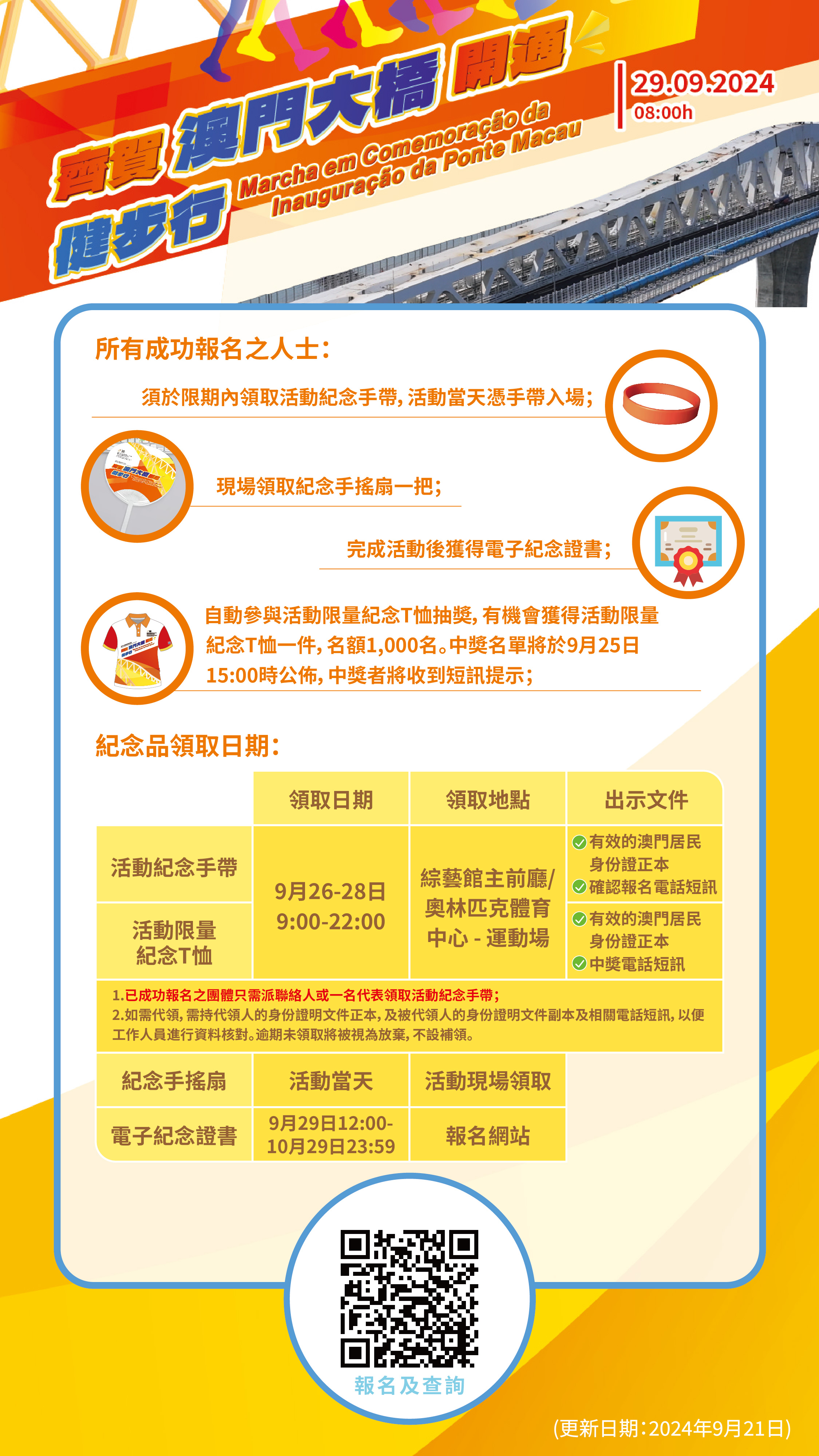 為熱烈慶祝中華人民共和國成立75周年及澳門特別行政區成立25周年,體育局將於9月29日,在澳門大橋開通前舉辦“齊賀澳門大橋開通健步行”。活動自9月19日報名以來,得到廣大市民的熱情參與,報名情況踴躍。體育局經與各相關部門會商,綜合評估後,將活動的參加名額由10,000個增加至17,000個。現時團體報名已結束,第一輪個人報名將於明(22)日上午10時至9月24日晚上9時進行,名額5,000;新增的第二輪個人報名則於9月24日上午10時至9月25日中午12時進行,名額7,000,額滿即止。