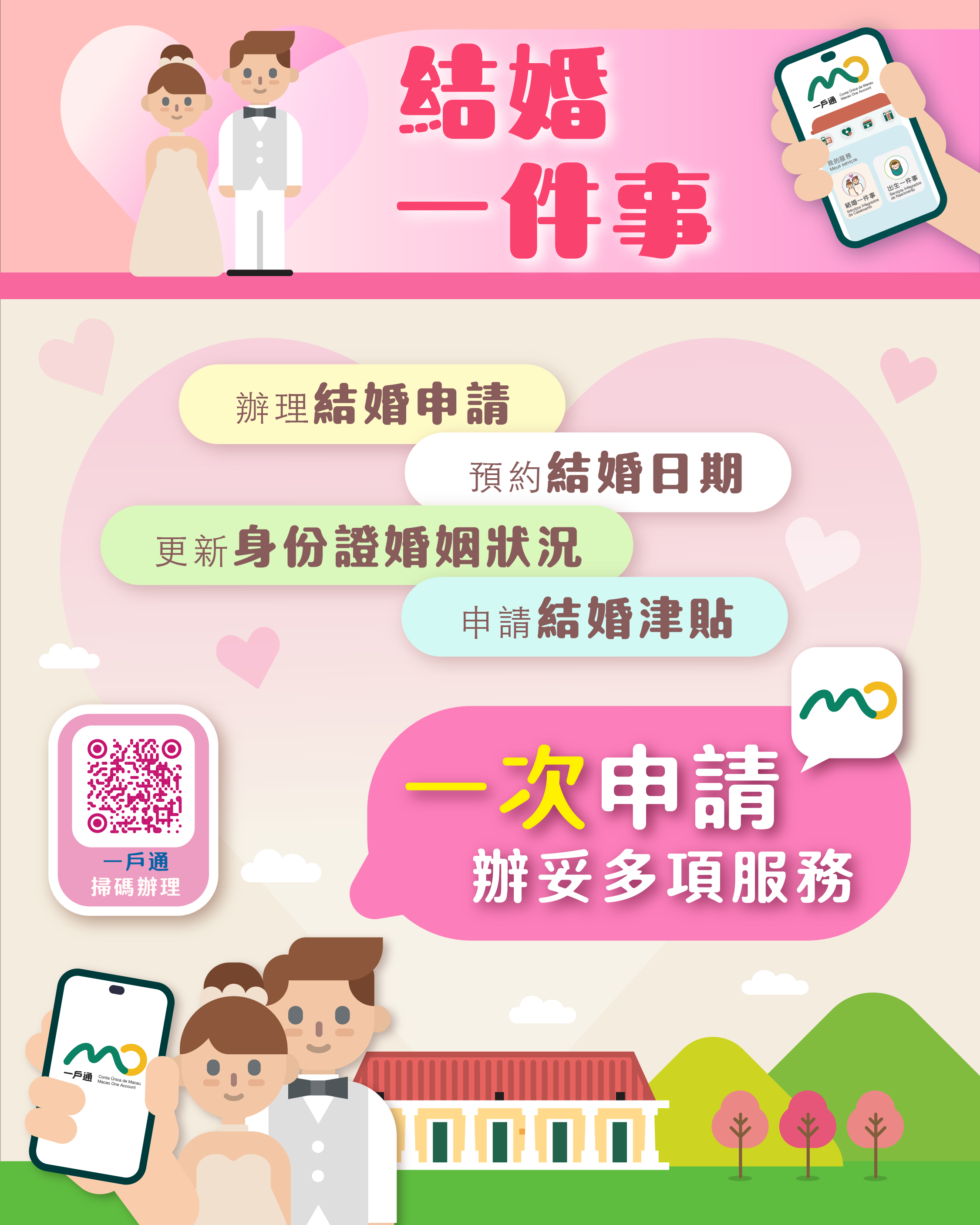 “結婚一件事”服務讓合資格的結婚人一次過辦理結婚申請、預約結婚日期、更新身份證婚姻狀況以及申請結婚津貼的服務。倘由登記官主持結婚,更可於登記後即時更新澳門居民身份證的婚姻狀況及領取結婚證明。
