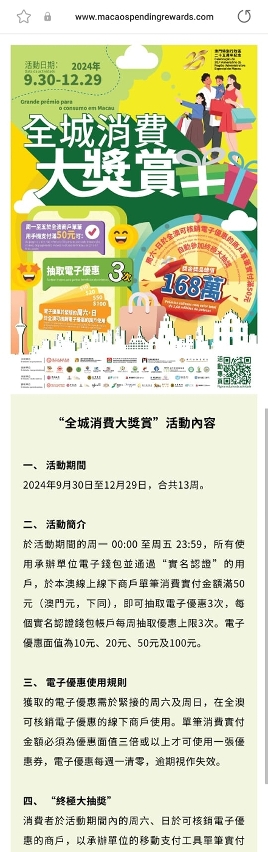 為提升活動吸引力,活動期間每逢周六、日,消費者透過承辦單位電子錢包在全澳可核銷電子優惠的商戶單筆實付50元,更可於活動結束後自動參加終極大抽獎,獎金獎品總值超過168萬元。