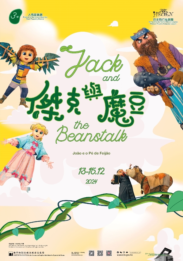 文化局將於12月13至15日為合家歡觀眾呈獻三場人偶音樂劇《傑克與魔豆》,日本飛行船劇團將載譽重臨澳門文化中心綜合劇院,以生動活潑的人偶帶領大家探索雲上的魔法世界。節目門票將於本周日(9月29日)早上10時起於澳門售票網等平台公開發售。