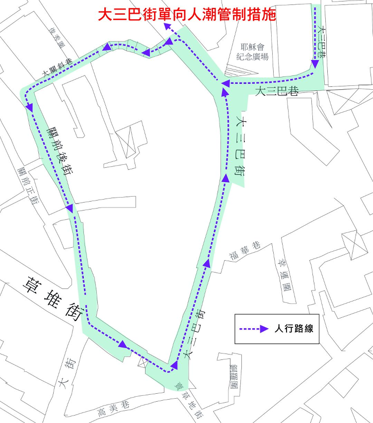 1.大三巴街單向人潮管制措施,當大三巴街(手信街)人群出現擠擁時,將會實施單向人潮管制措施,人流只可單向上行往牌坊,並取道周邊的街巷如大關斜巷、關前後街、高園街等離開。另外,在有需要時,會在女媧廟位置同時實施分倉分流措施(詳見附圖五)。
