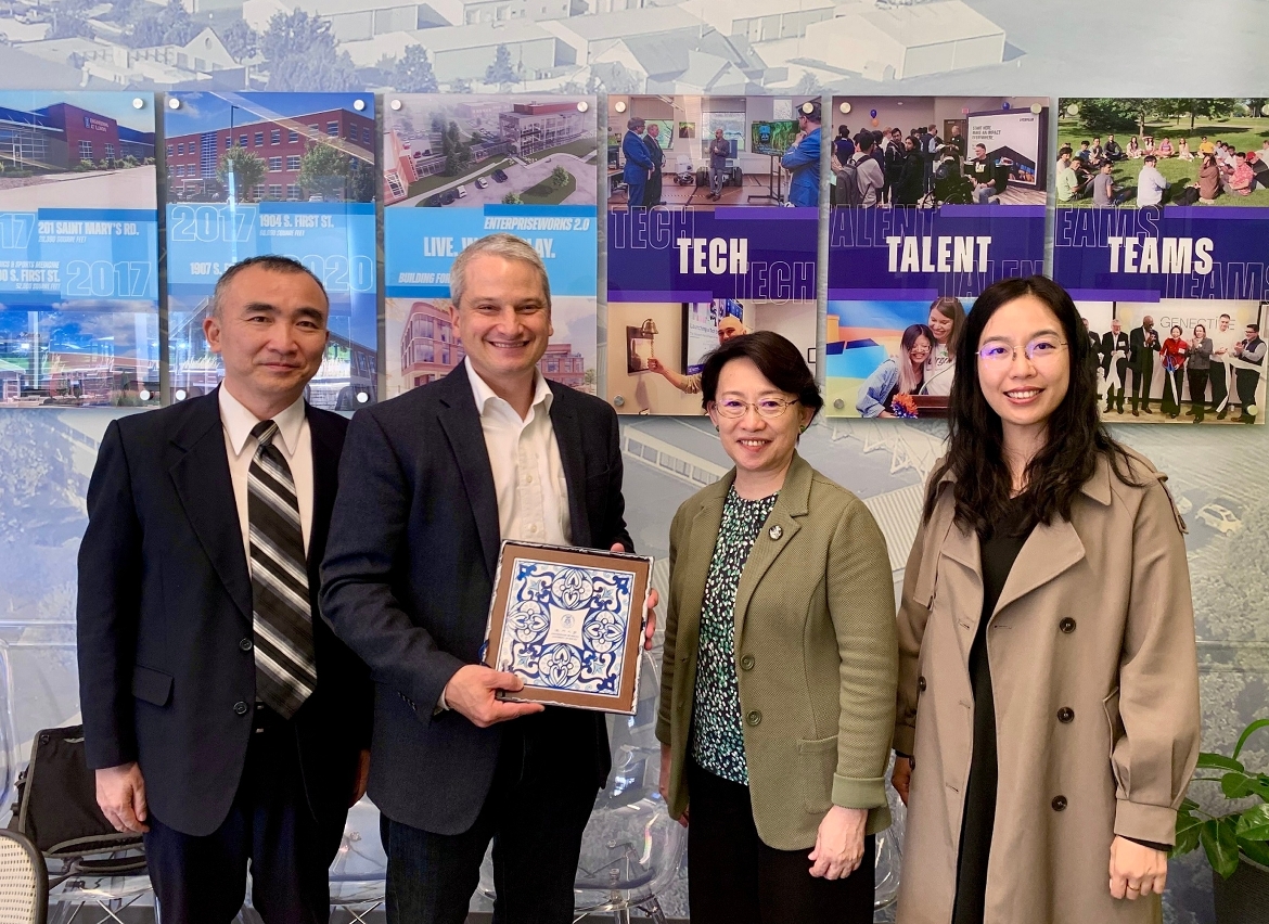 在伊利諾伊大學香檳分校,代表團與該校的技術管理辦公室主任Nathan Hoffmann就建立科研成果轉化體系等議題展開深入討論,並與該校的企業關係辦公室副主任Pedro Fernandes da Costa、Ulyssia Dennis和Stephanie Larson就大學如何和企業、商界建立全方位合作、如何設立獲得社會各界支持的機制和實踐作深入交流。代表團亦與該大學的創新創業平台Research Park & EnterpriseWorks主任Gerald O. Wilson會面,聽取培養創新創業文化、運作硬核科技孵化器等意見,並就連接業界專家、建立風險投資網絡等分享各自經驗。